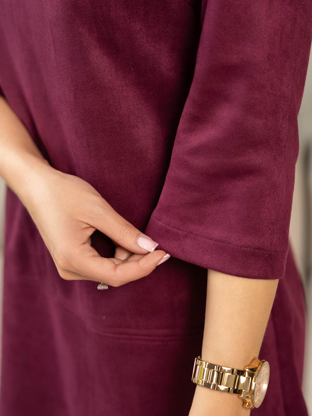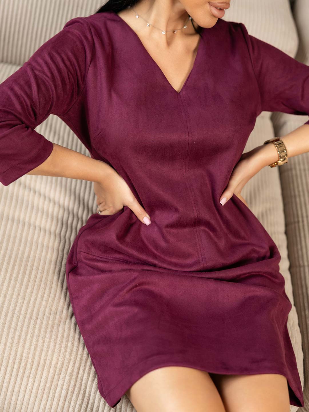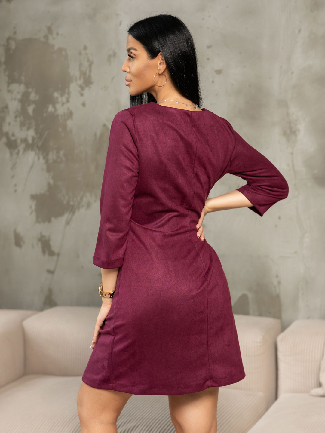 Платье прилегающего силуэта, из искусственной замши, длиной до середины бедра, с V-образной горловиной и рукавом 3/4.Платье отлично впишется в повседневный гардероб, идеально будет смотреться с массивными ботинками, либо с ботфортами.