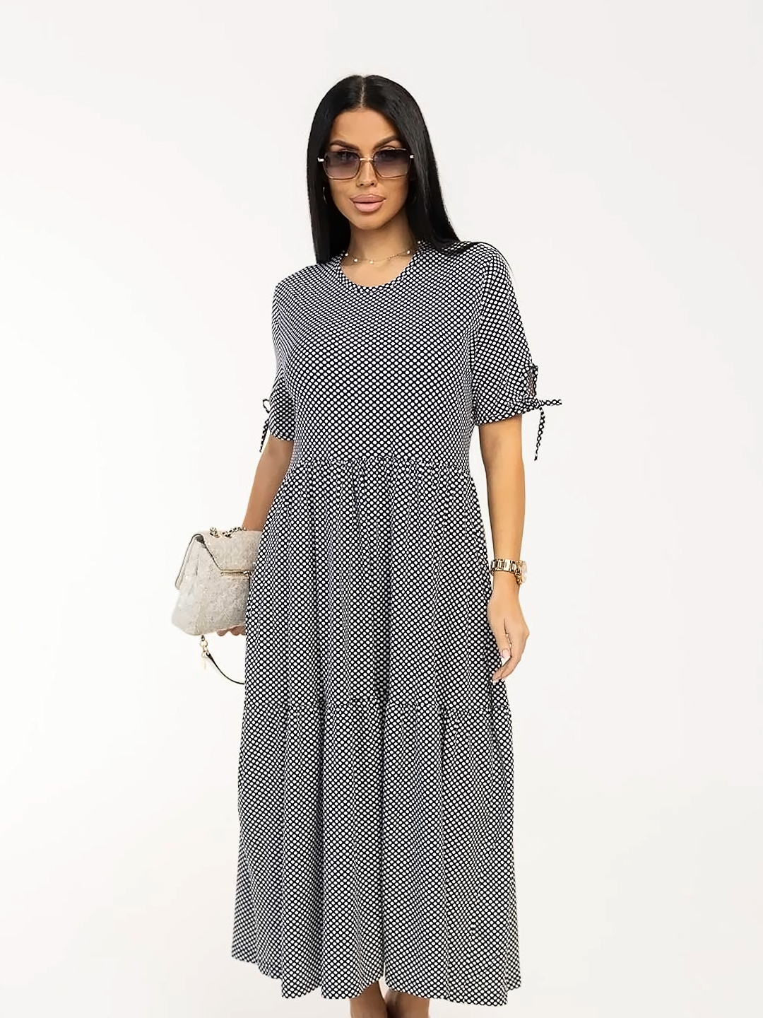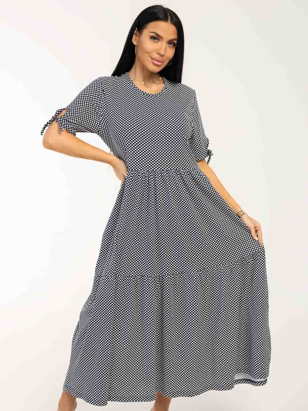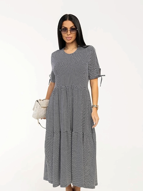 Свободный крой платья позволит вам чувствовать себя уверенно. Короткий рукав делает платье универсальным и подходящим для повседневной носки, несколько рядов воланов добавит кокетливости в образ.