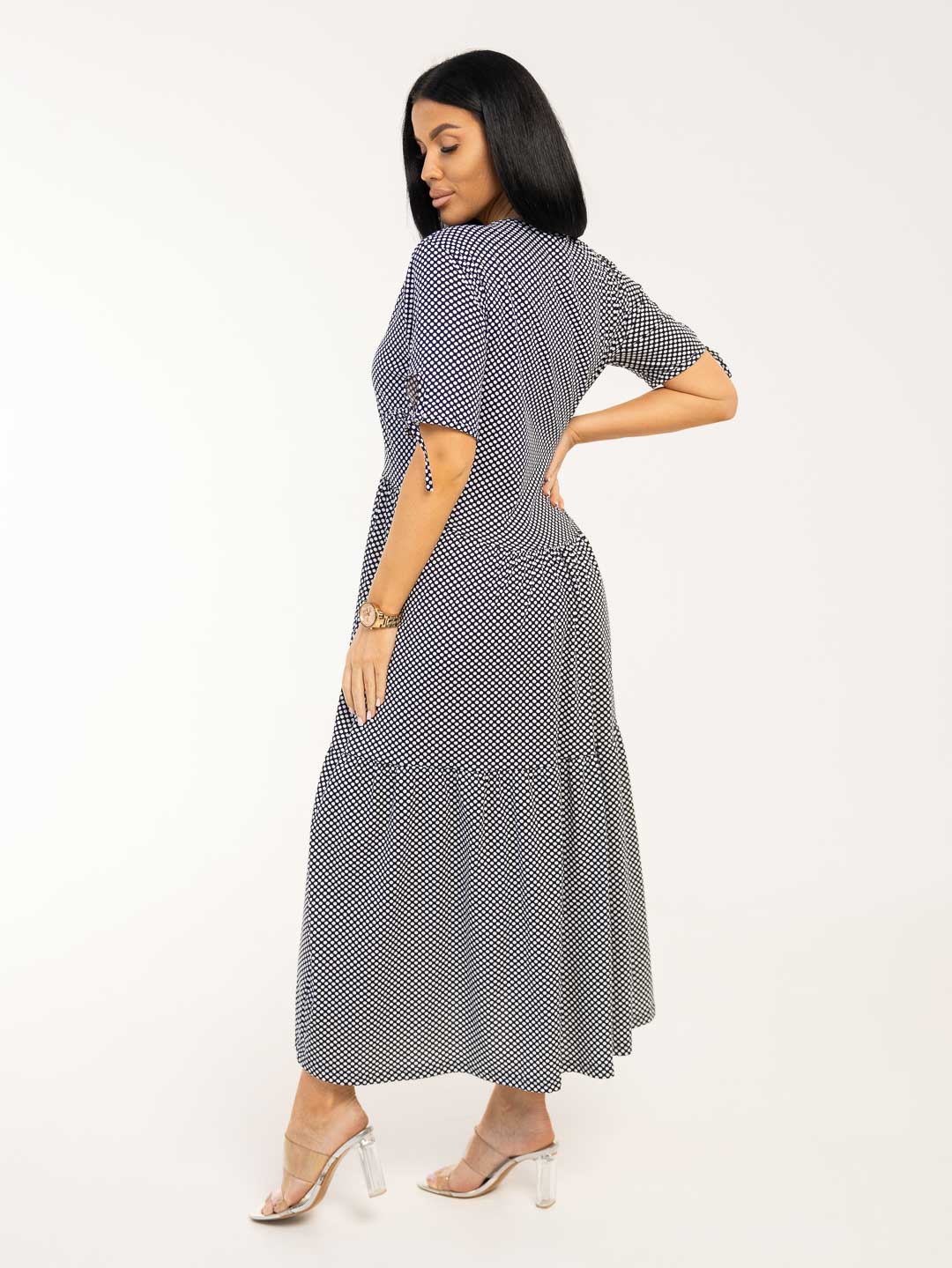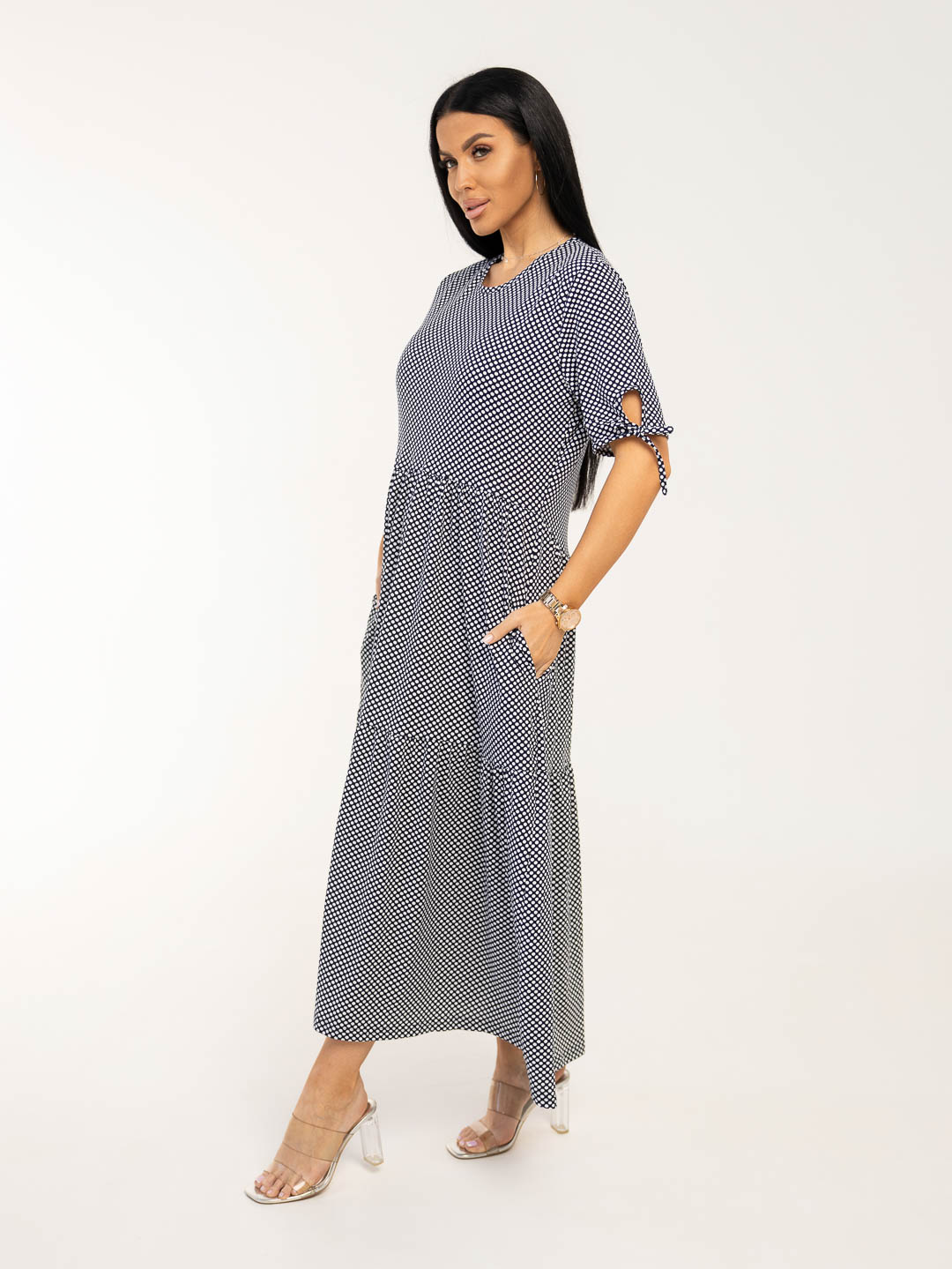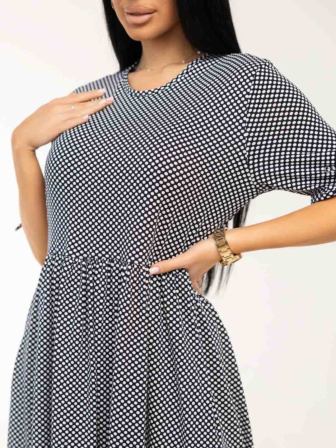Свободный крой платья позволит вам чувствовать себя уверенно. Короткий рукав делает платье универсальным и подходящим для повседневной носки, несколько рядов воланов добавит кокетливости в образ.