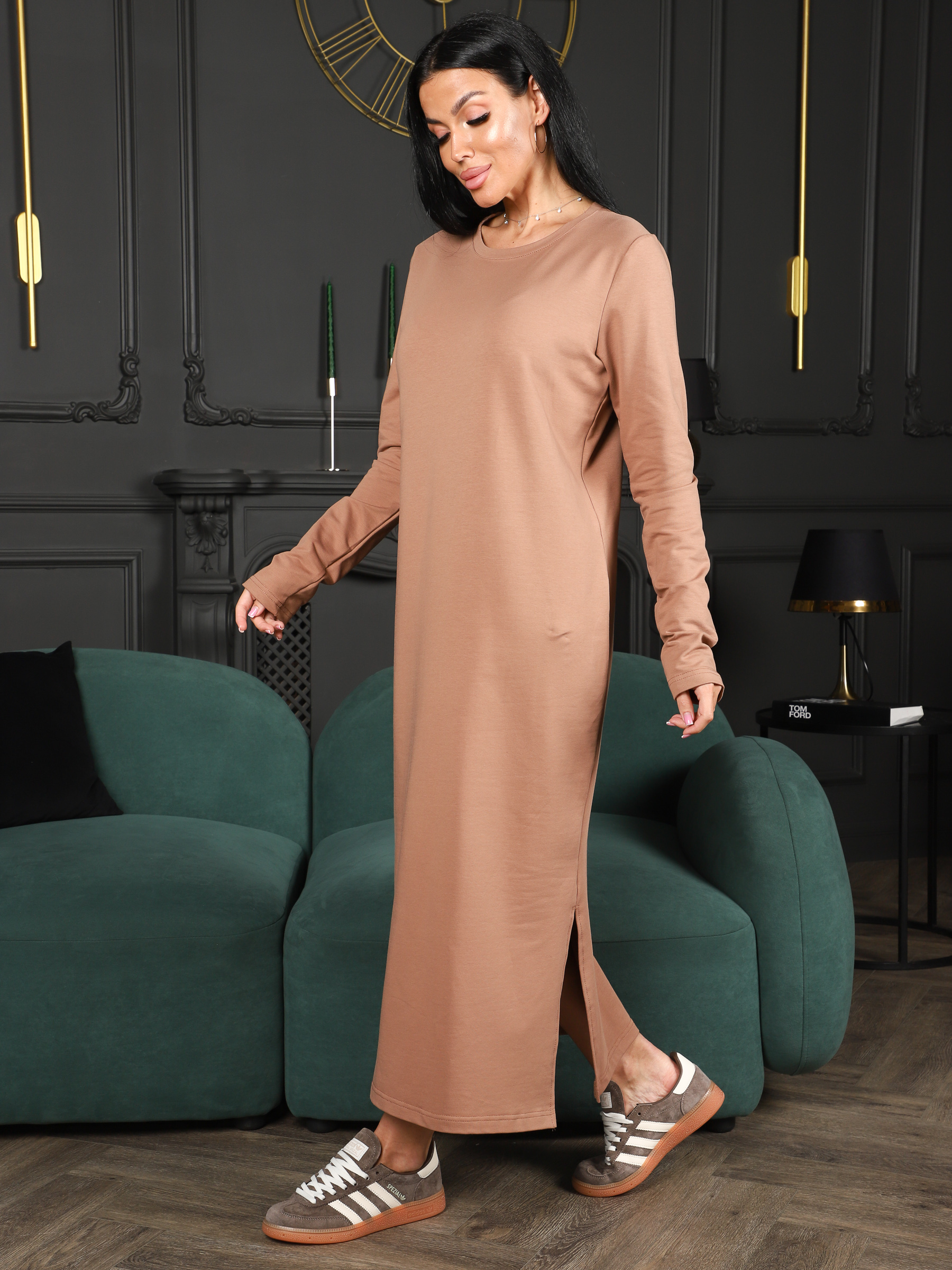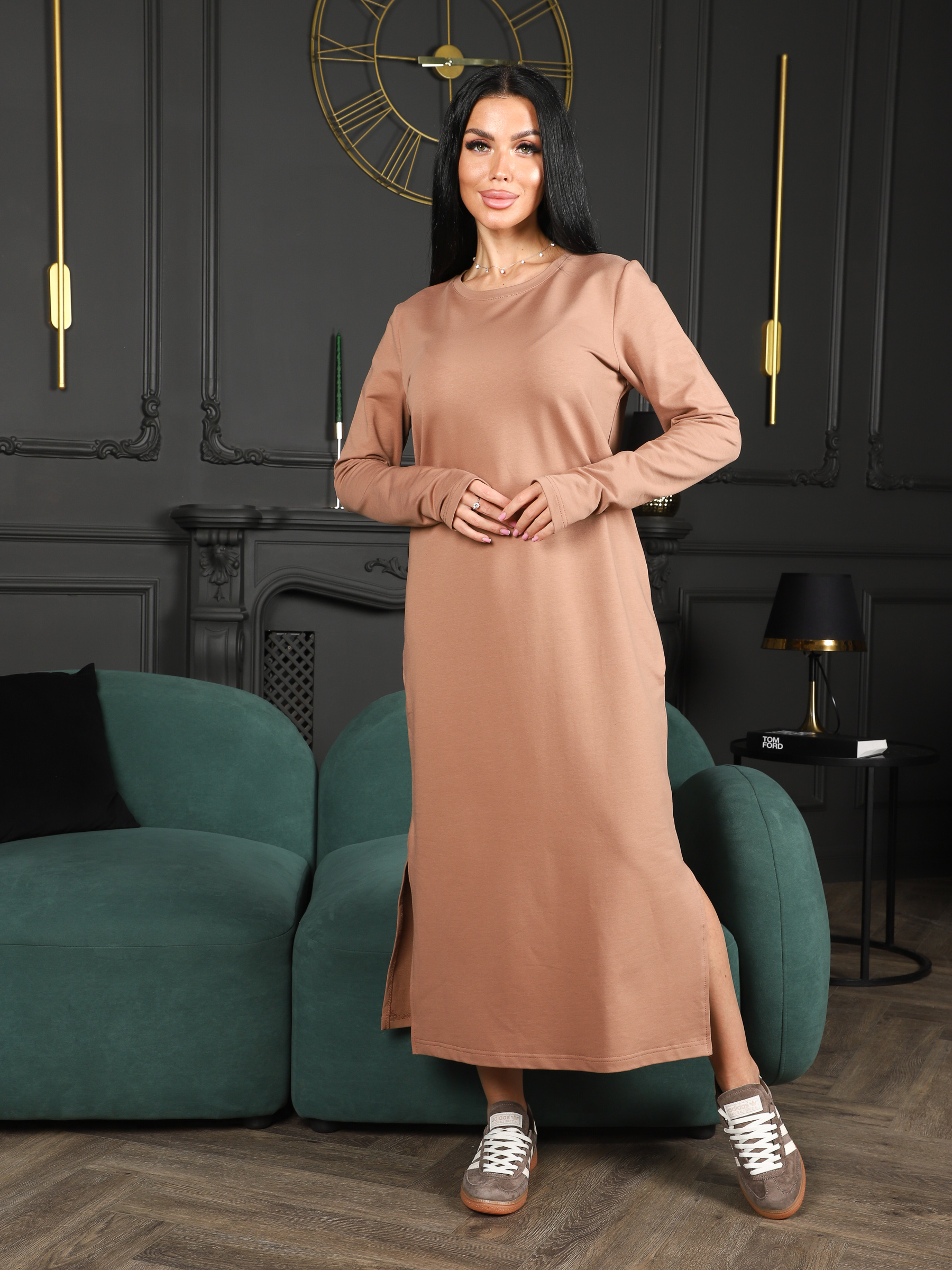 Платье женское трикотажное, свободного силуэта, с боковым вырезом в нижней части. Рукав - втачной, удлиненный. Классический округлый вырез. Базовая модель, на каждый день. Отлично сидит на любом типе фигуры. Подчеркнет достоинства и скроет недостатки.
