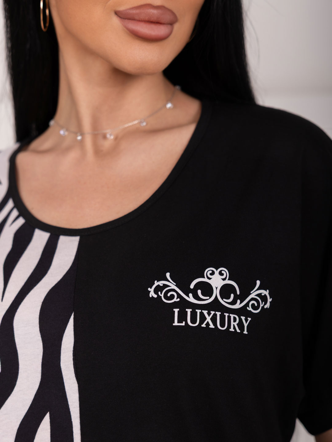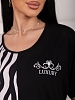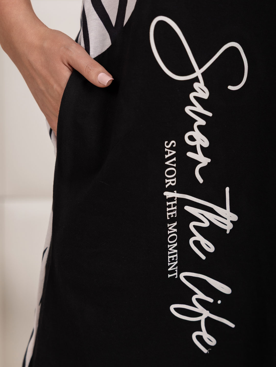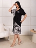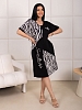 Женское платье ассиметричное с печатью, с цельнокроеным рукавом, V-образной горловиной и карманами в боковых швах.