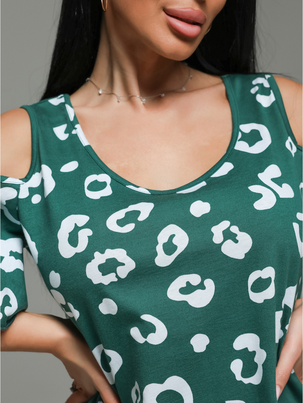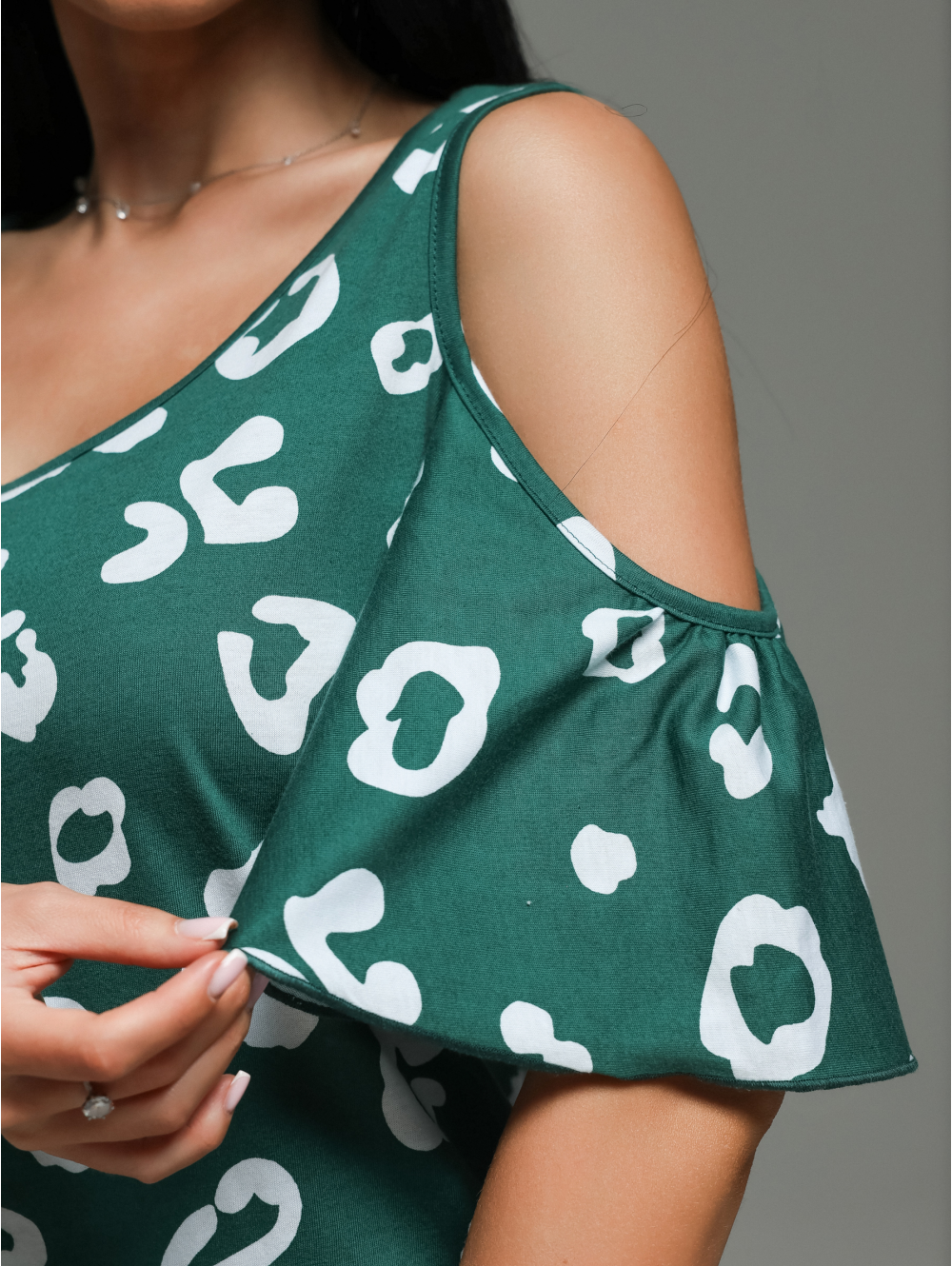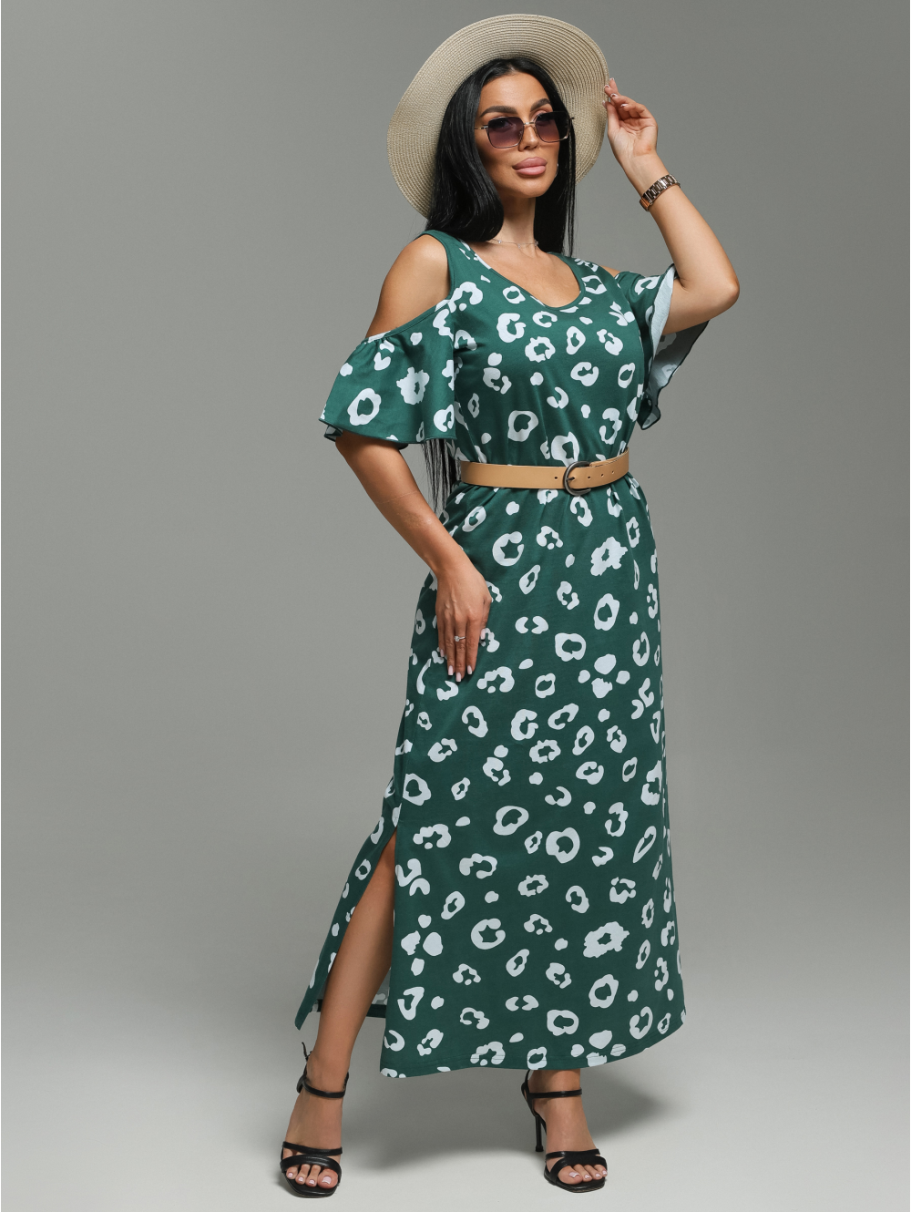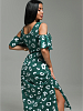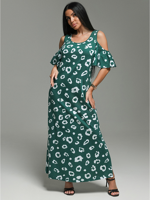 платье в форме трапеции дополняет рукав-волан с открытым плечом. Все это