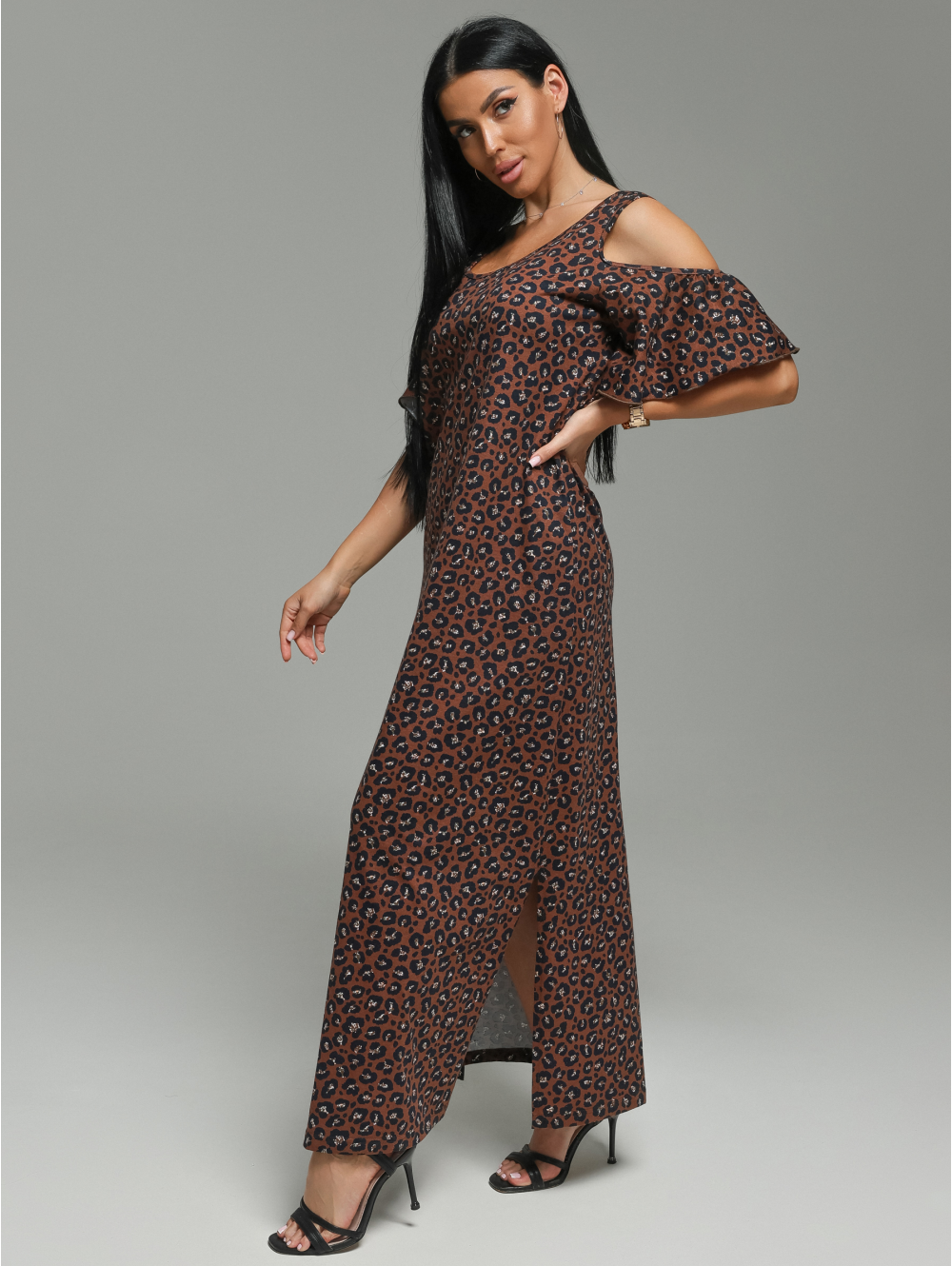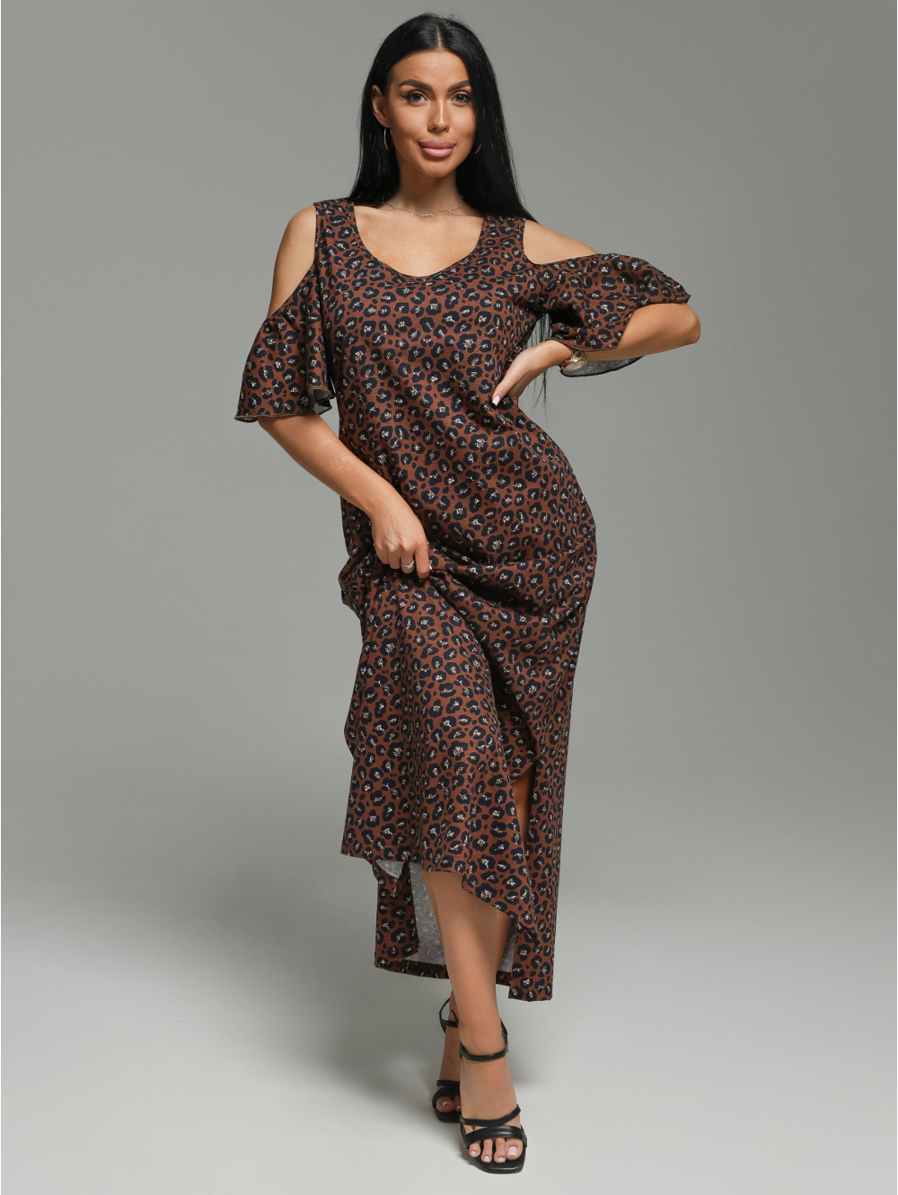 платье в форме трапеции дополняет рукав-волан с открытым плечом. Все это