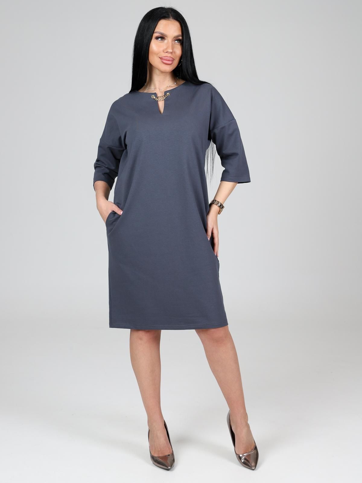 Платье подойдет для торжественного случая, а так же для повседневной носки. Модель прямого силуэта, длиной до колен, с карманами в боковых швах, рукав ¾. Модная, универсальная модель походит всем - стройным женщинам и дамам с формами.