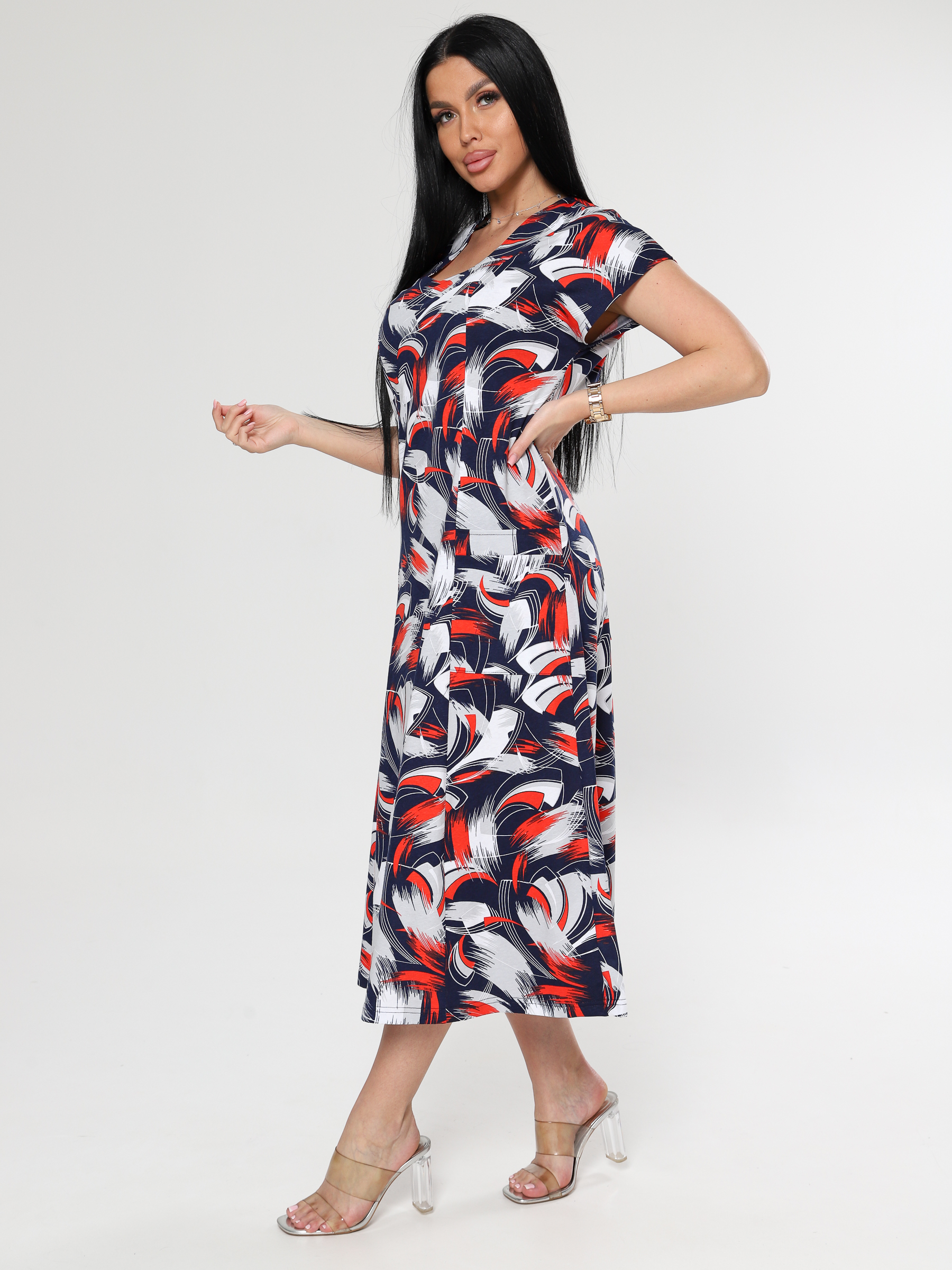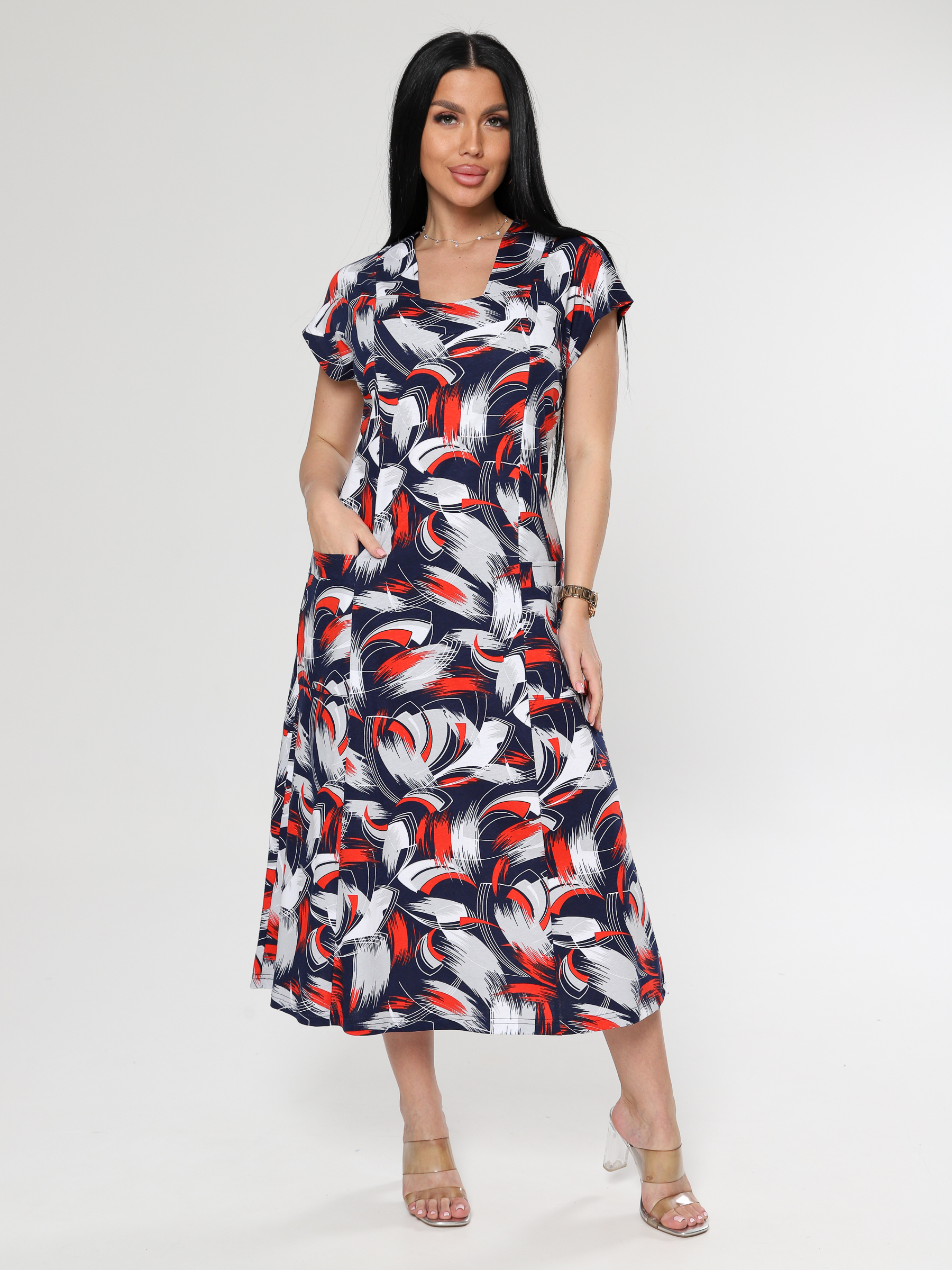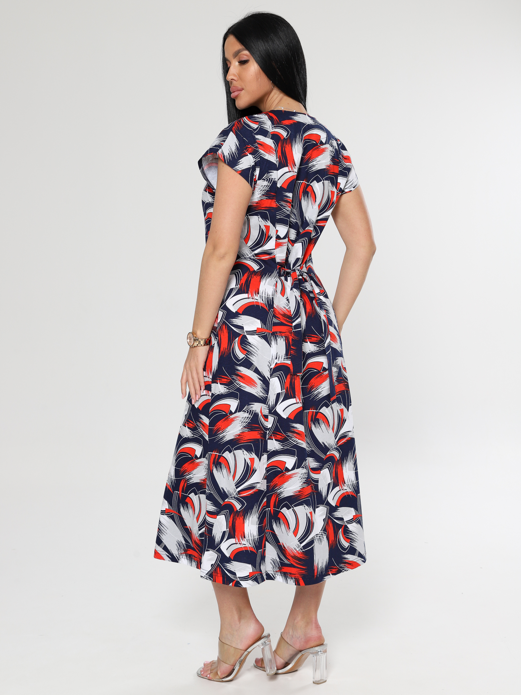 Платье женское полуприлегающего кроя. Платье трикотажное с двумя хлястиками на спинке. Рельефы придадут женственность образу, а 2 накладных кармана придадут практичность. Юбка трапецией не сковывает движения. Платье хорошо сидит по фигуре. Натуральное дышащее полотно - кулирка, позволяет комфортно и удобно чувствовать себя.