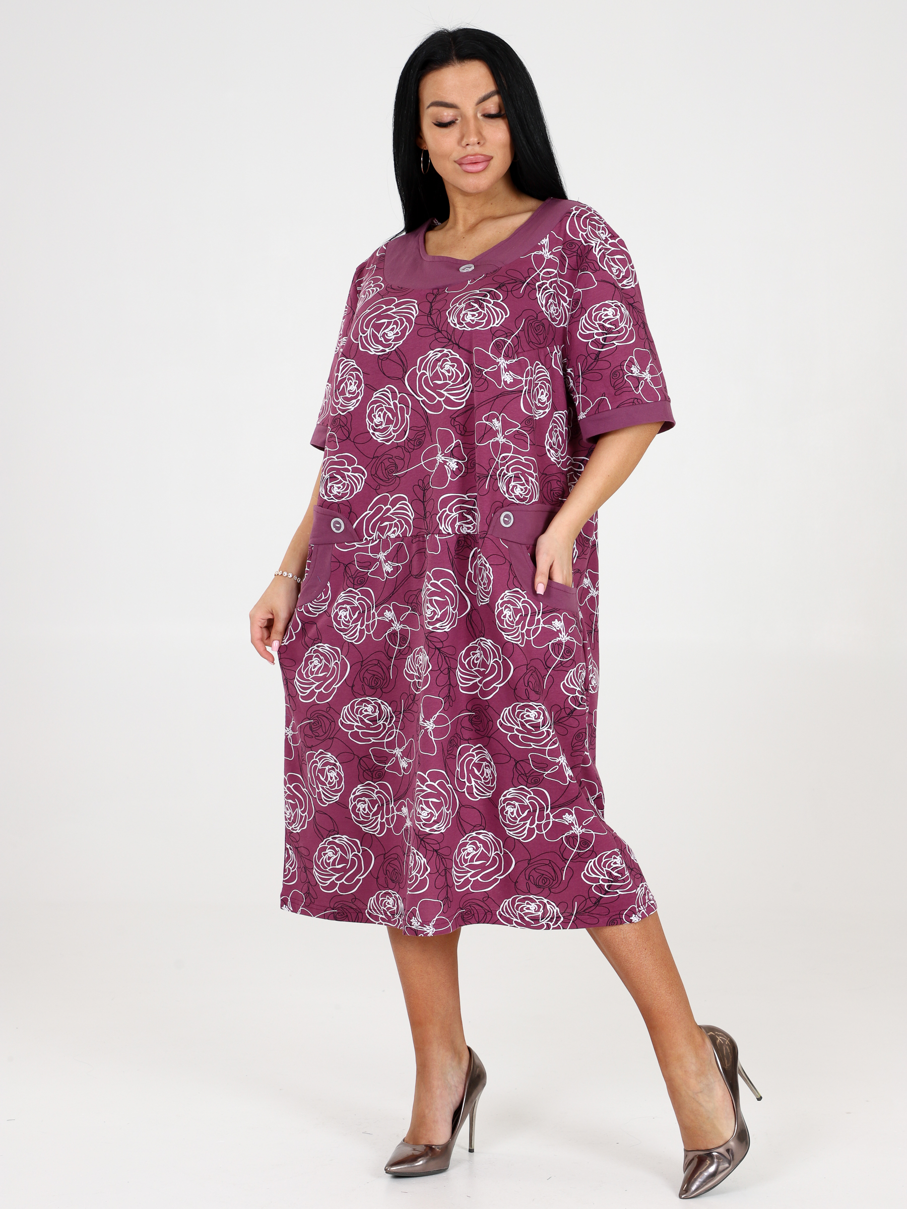 Платье трикотажное больших размеров Ретро Персона. Вход в карман обработан отделочной тканью, над карманом декоративный клапан. Горловина полочки отделана фигурным элементом, декорированным пуговицей. Отрезная полочка по уровню верхнего уровня карманов. Благодаря этому визуально создается женственный силуэт, корректирующий фигуру.