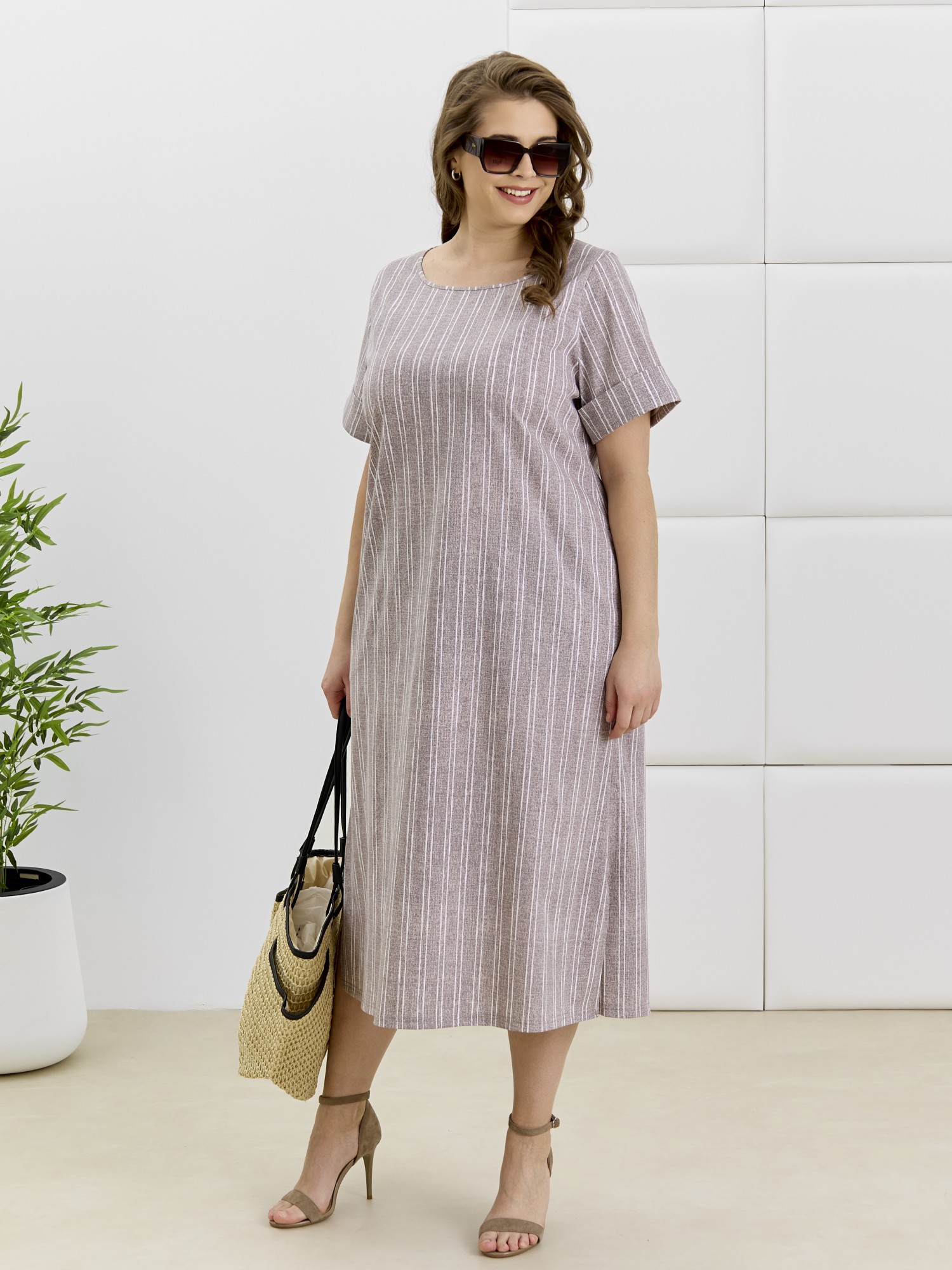 Платье женское из трикотажного полотна «кулирка» с набивным рисунком, длинное, расширенное к низу, с горловиной овальной формы окантованной основным материалом, короткими втачными рукавами, обработанными манжетами. В боковых швах выполнены карманы, в нижней части- боковые разрезы.