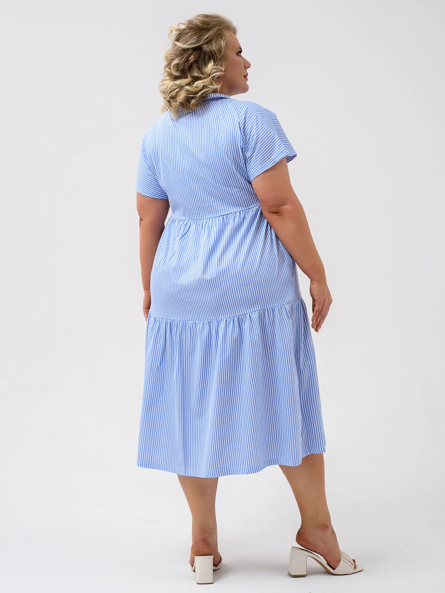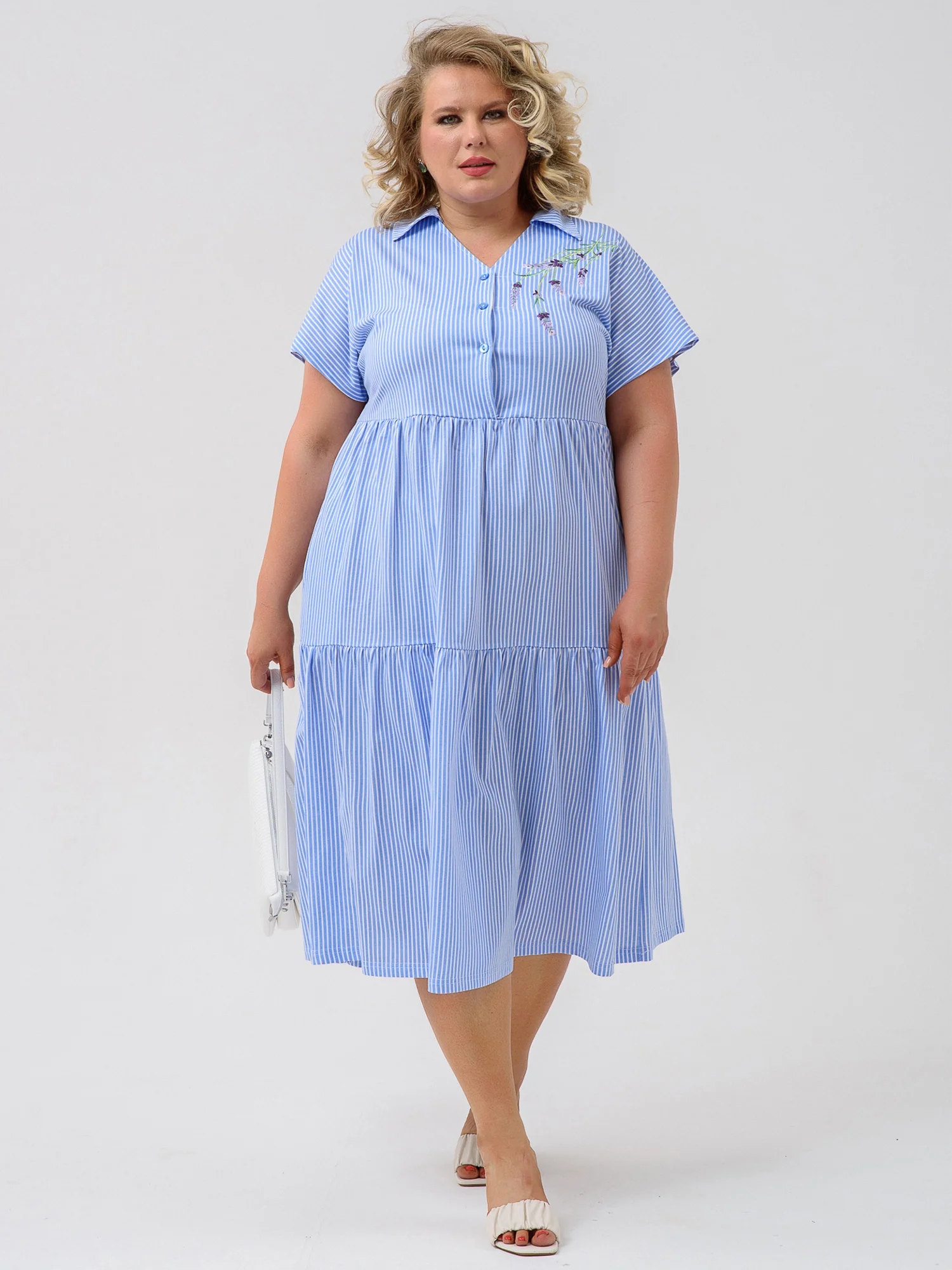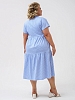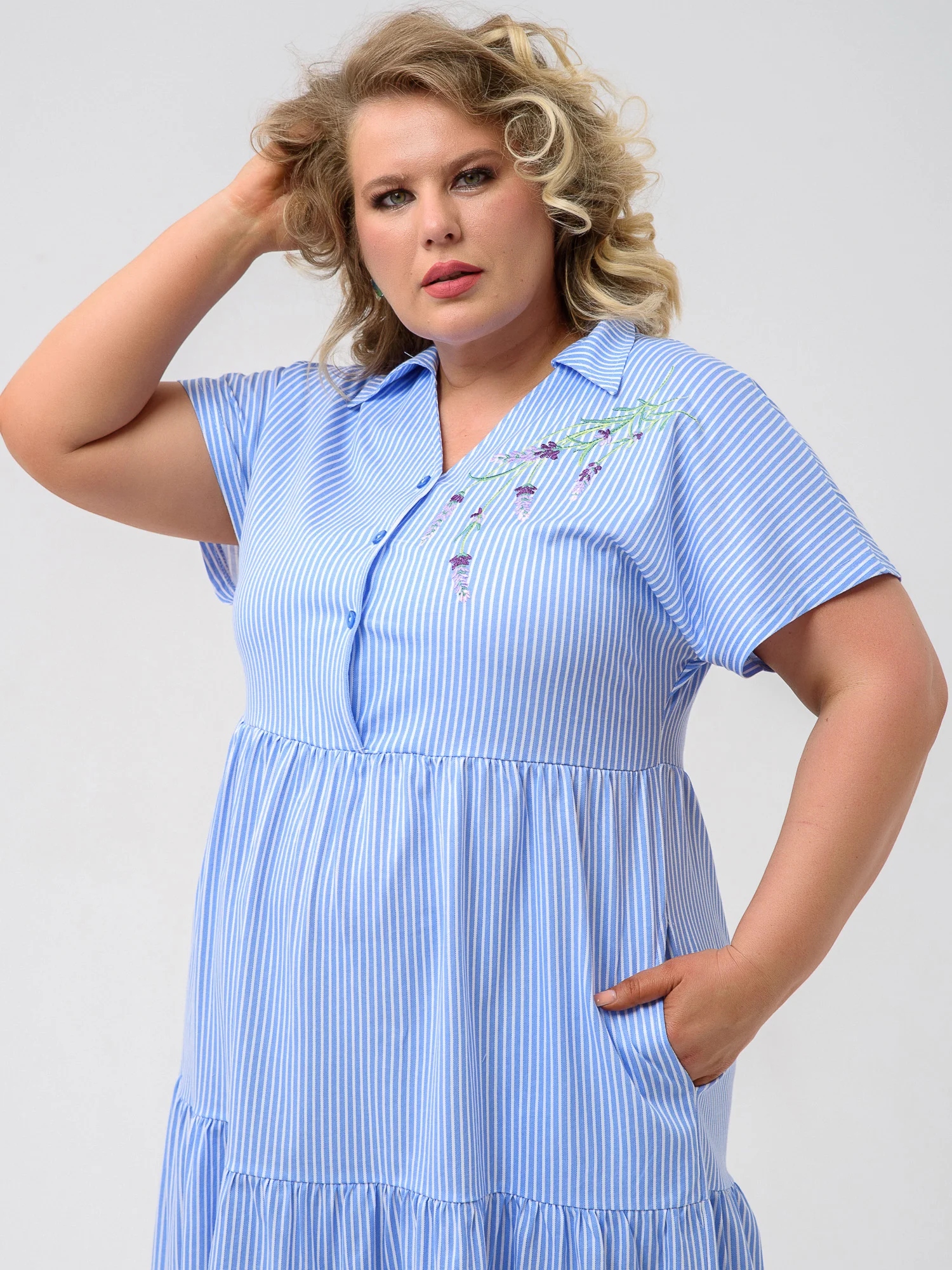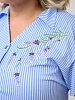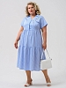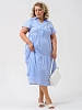 Платье женское "Шалфей" 1928-К / Голубой из набивного трикотажного х/б полотна. Изделие А-образного силуэта, длиной ниже линии колена. Изделие отрезное с завышенной линией талии и по линии бёдер. Платье с V- образной формой горловины и отложным воротником с острыми концами, со спущенным цельнокроеным рукавом и застёжкой на петли пуговицы по линии борта. На полочке с левой стороны вышивка. В боковых швах обработаны карманы с фигурной линией входа.