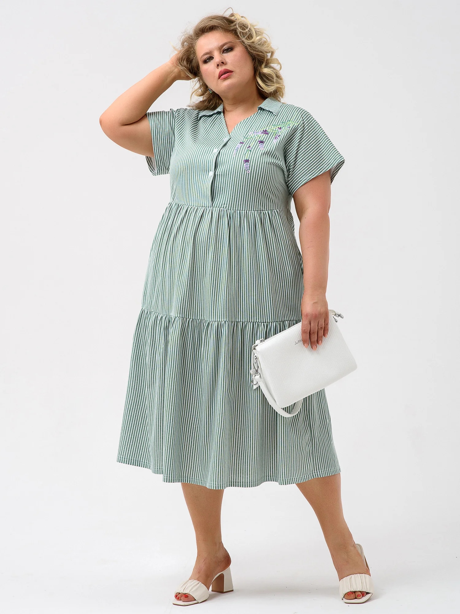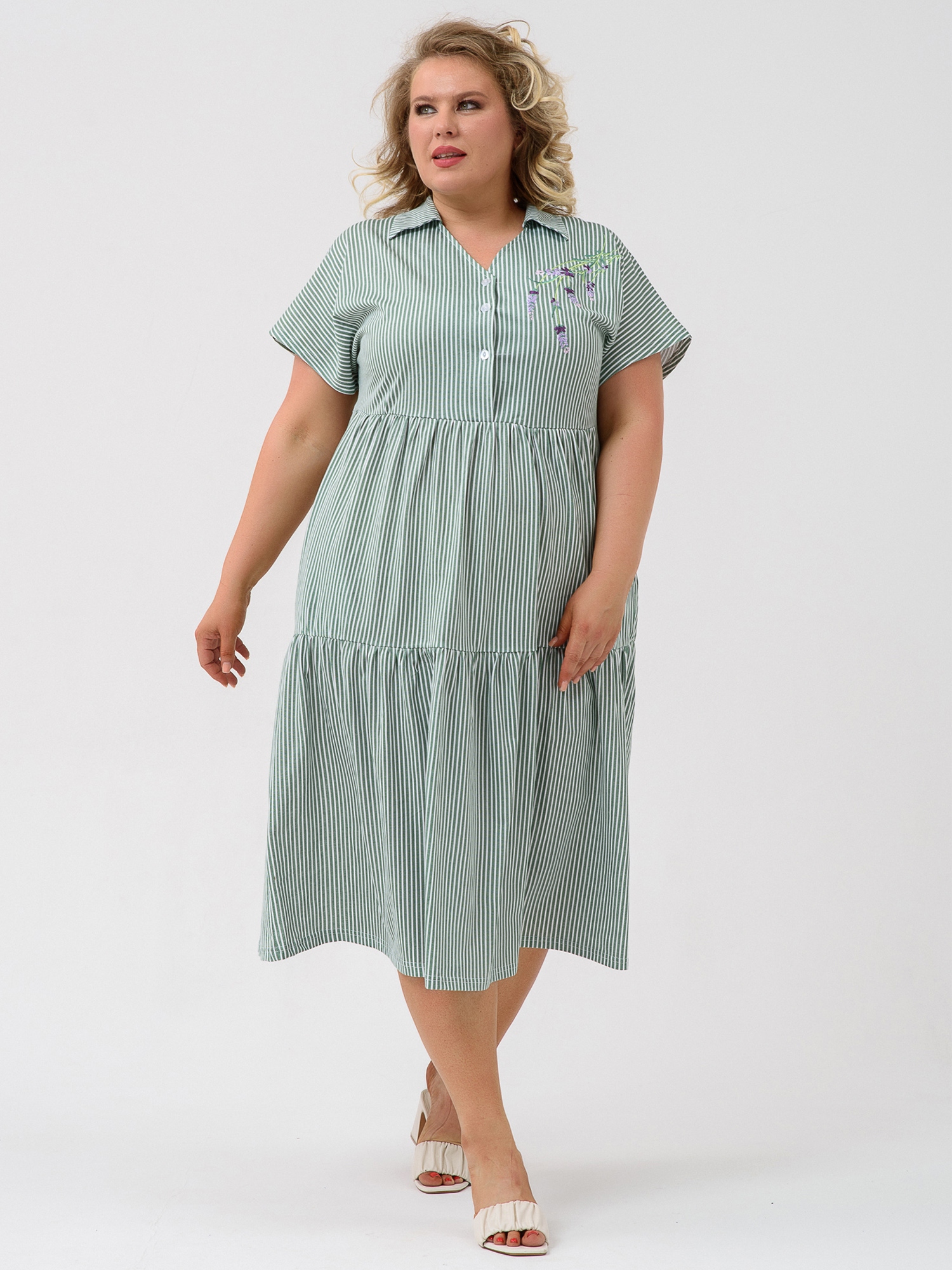 Платье женское "Шалфей" 1928-К / Зеленый из набивного трикотажного х/б полотна. Изделие А-образного силуэта, длиной ниже линии колена. Изделие отрезное с завышенной линией талии и по линии бёдер. Платье с V- образной формой горловины и отложным воротником с острыми концами, со спущенным цельнокроеным рукавом и застёжкой на петли пуговицы по линии борта. На полочке с левой стороны вышивка. В боковых швах обработаны карманы с фигурной линией входа.
