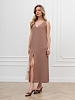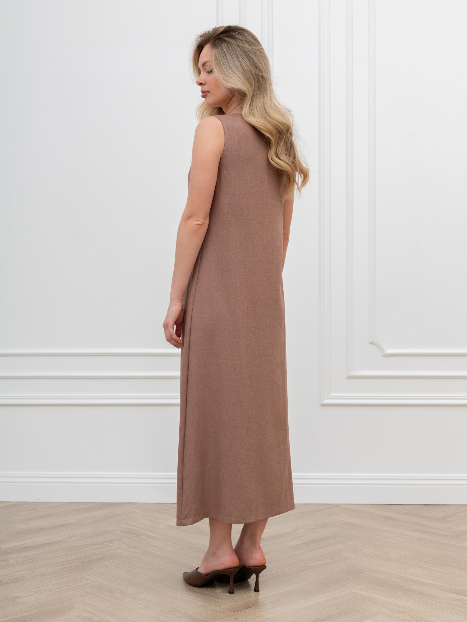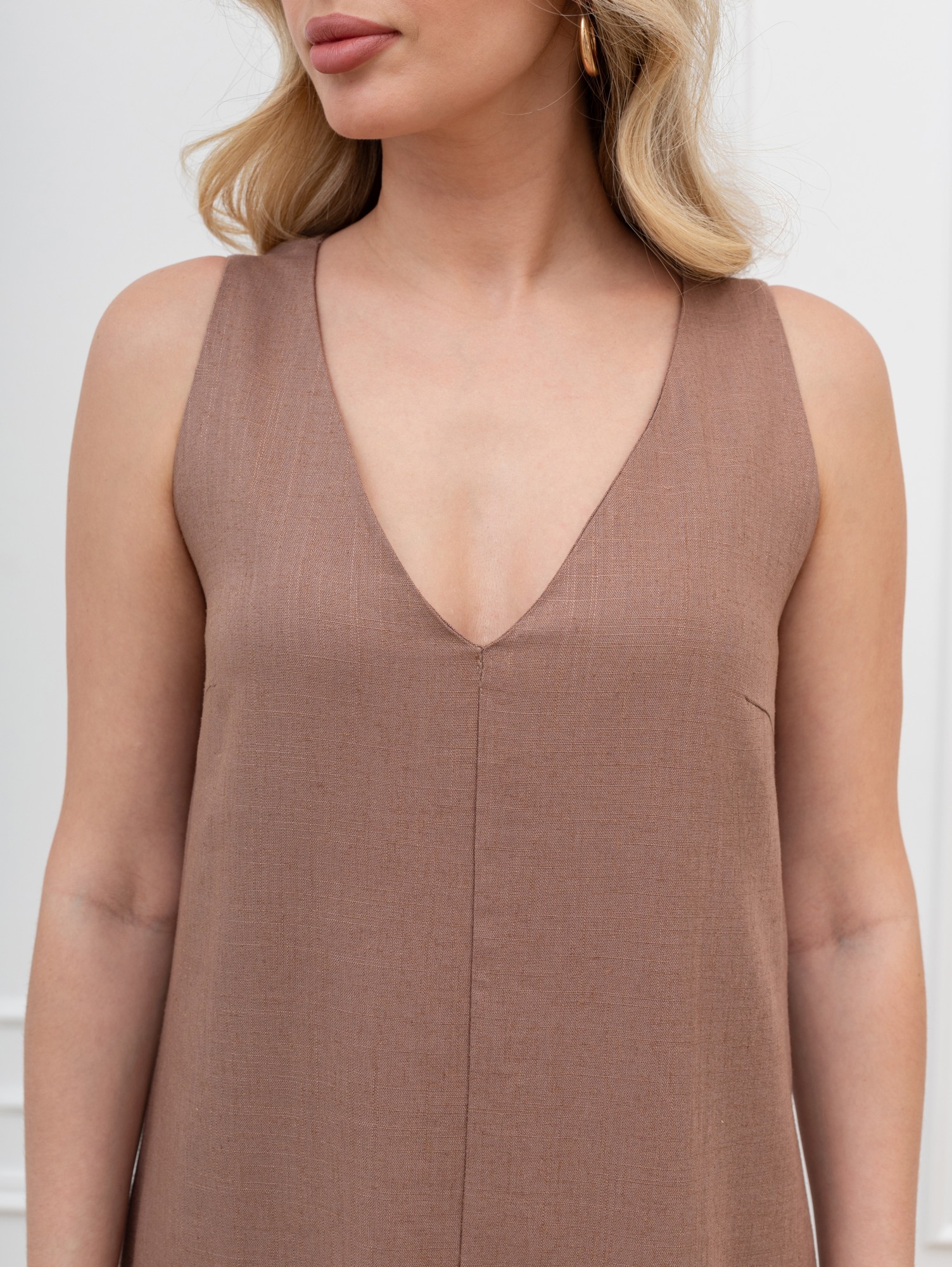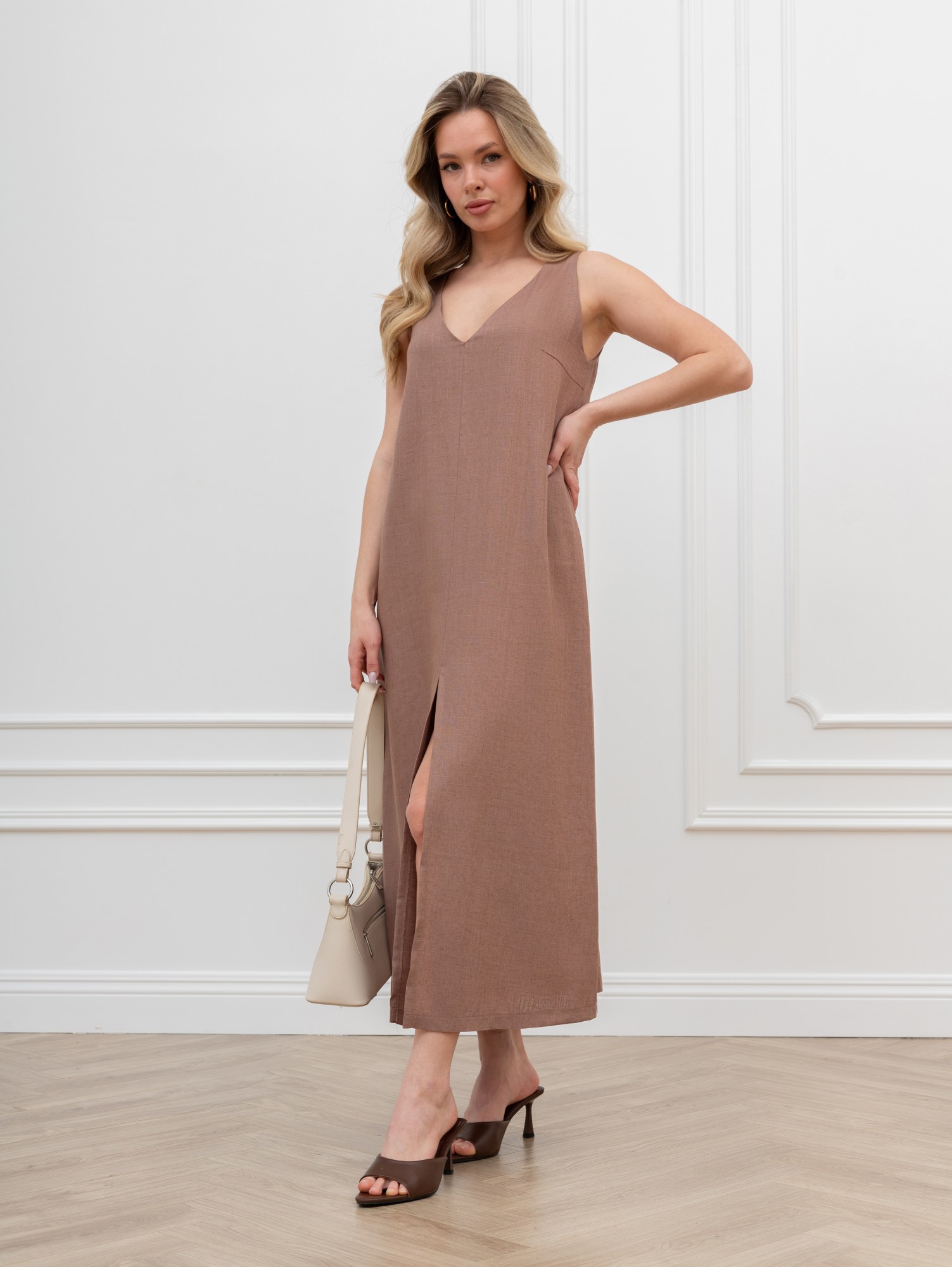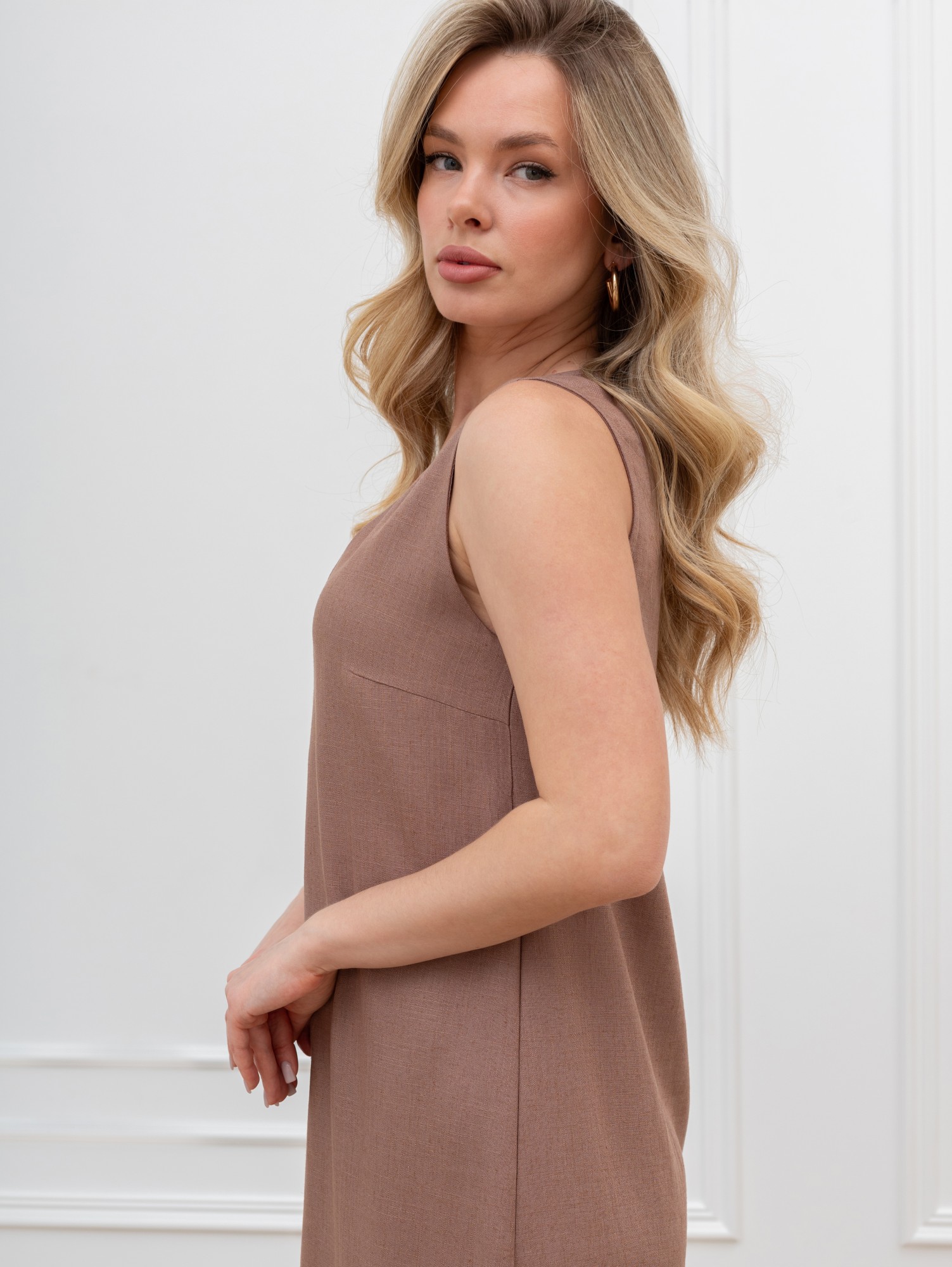 Платье женское из гладкокрашеного тканого полотна, свободное, слегка расширенное к низу, с глубоким V-образным вырезом горловины, обработанным внутренней обтачкой, без рукавов, с вытачками в области груди. Перед состоит из двух частей, в шве соединения деталей по центру длинный разрез.