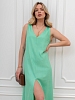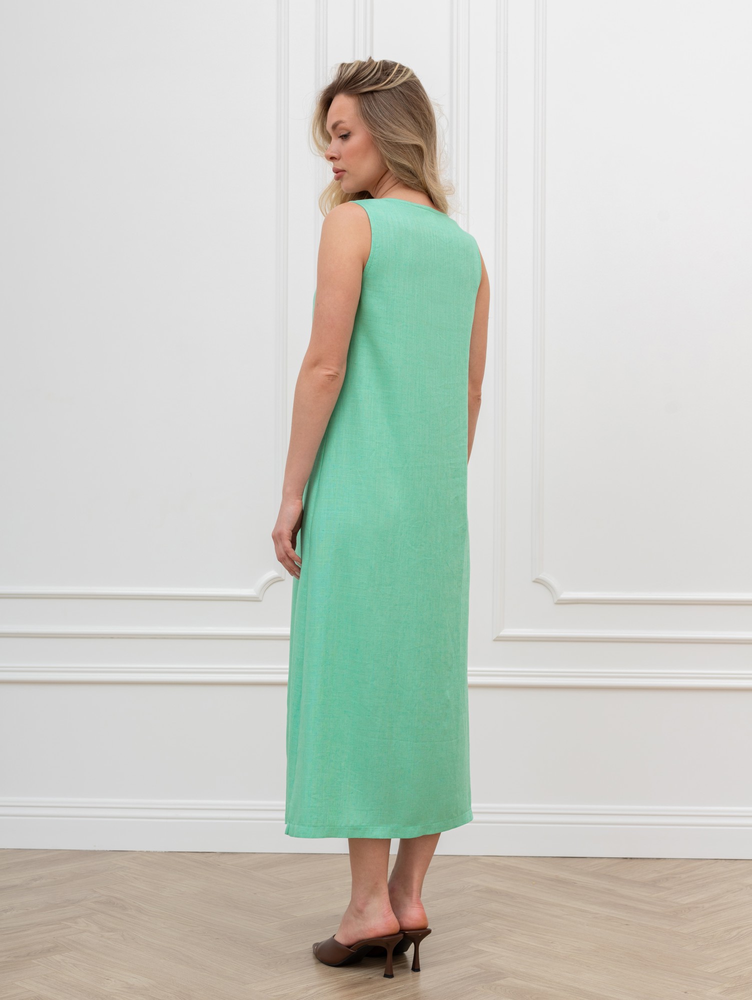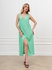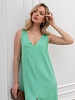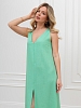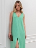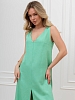 Платье женское из гладкокрашеного тканого полотна, свободное, слегка расширенное к низу, с глубоким V-образным вырезом горловины, обработанным внутренней обтачкой, без рукавов, с вытачками в области груди. Перед состоит из двух частей, в шве соединения деталей по центру длинный разрез.