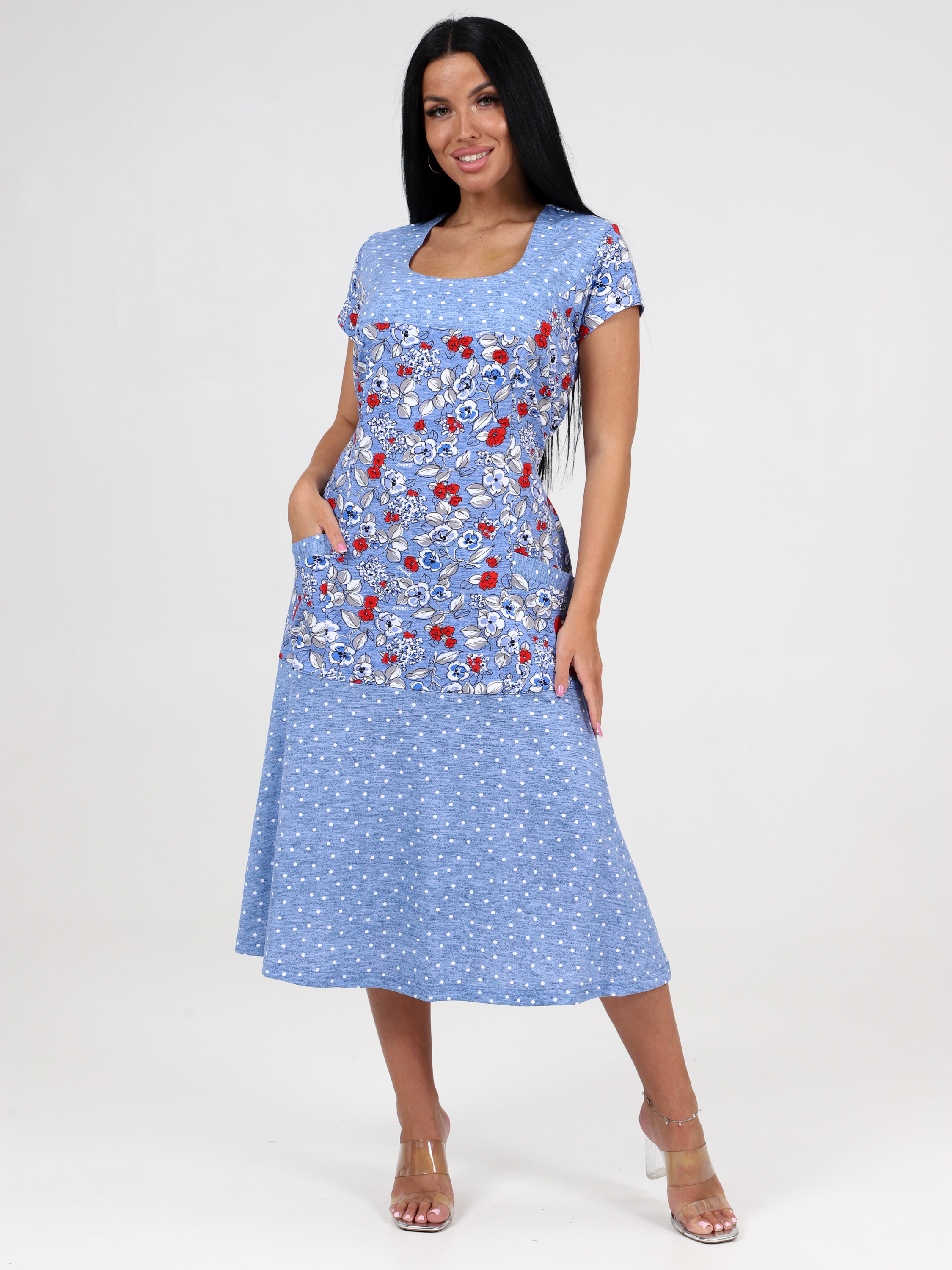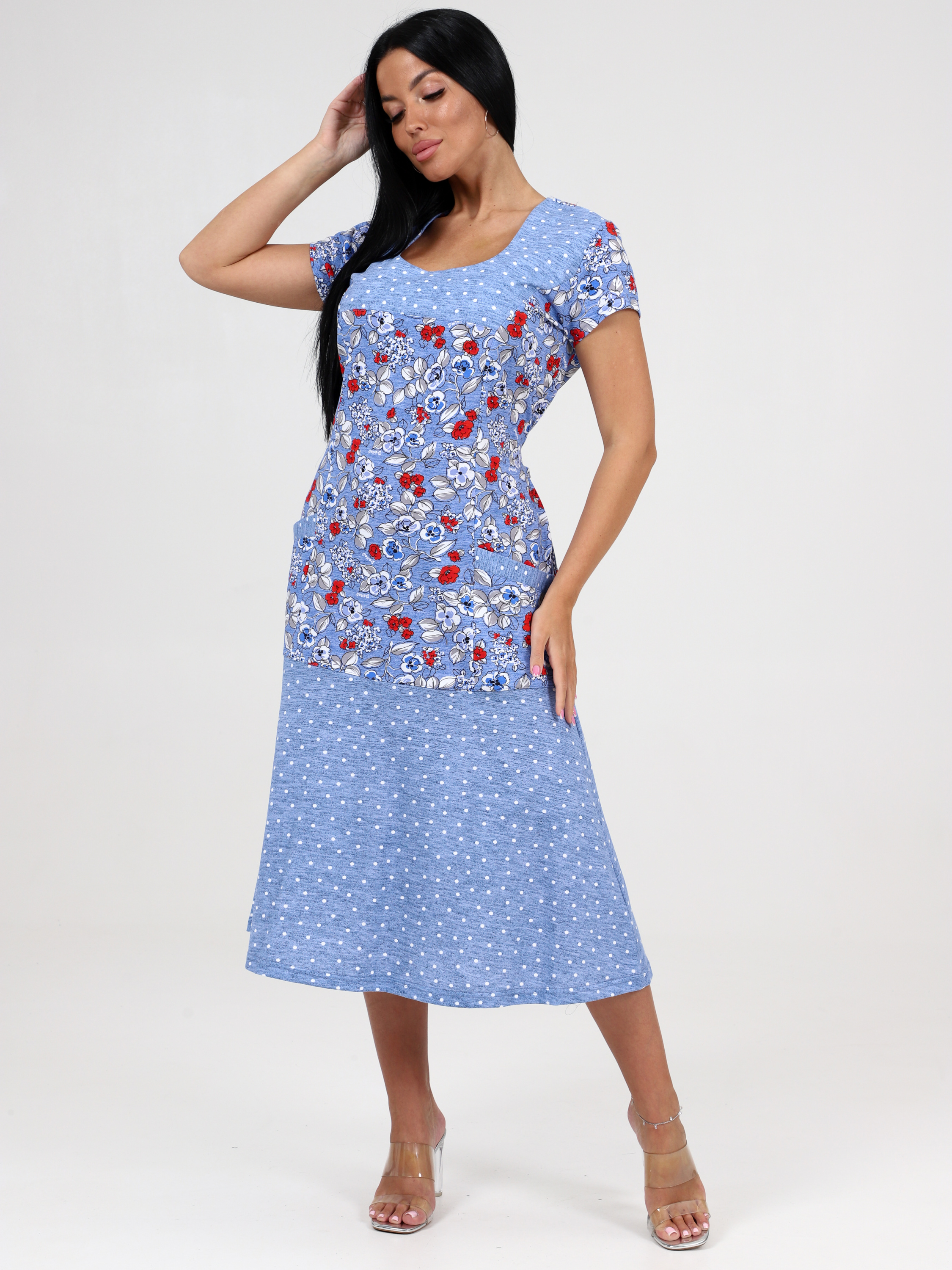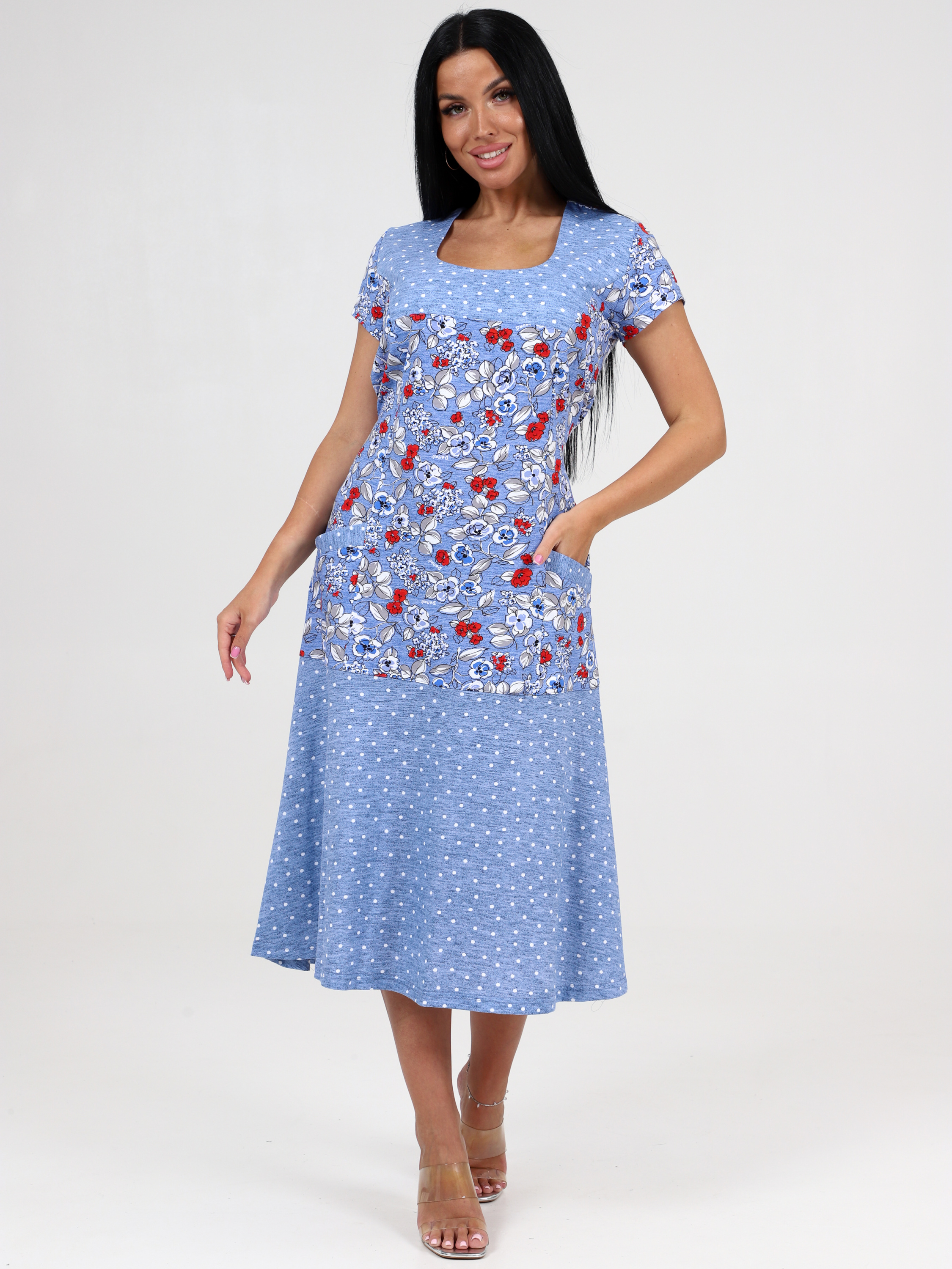 Платье трикотажное больших размеров, хорошо сидит по фигуре. В боковых швах 2 хлястика. Для практичности предусмотрены 2 накладных кармана.