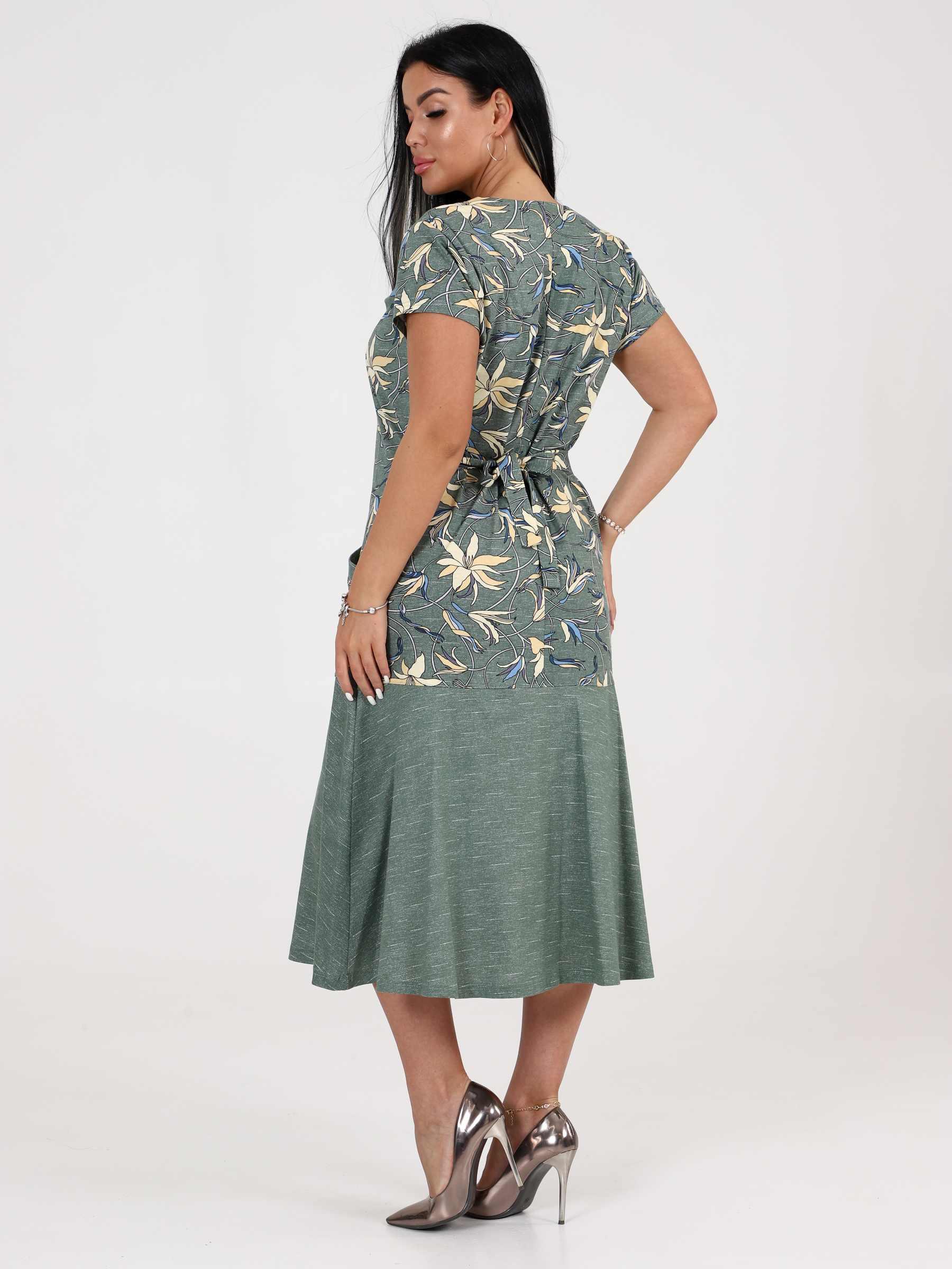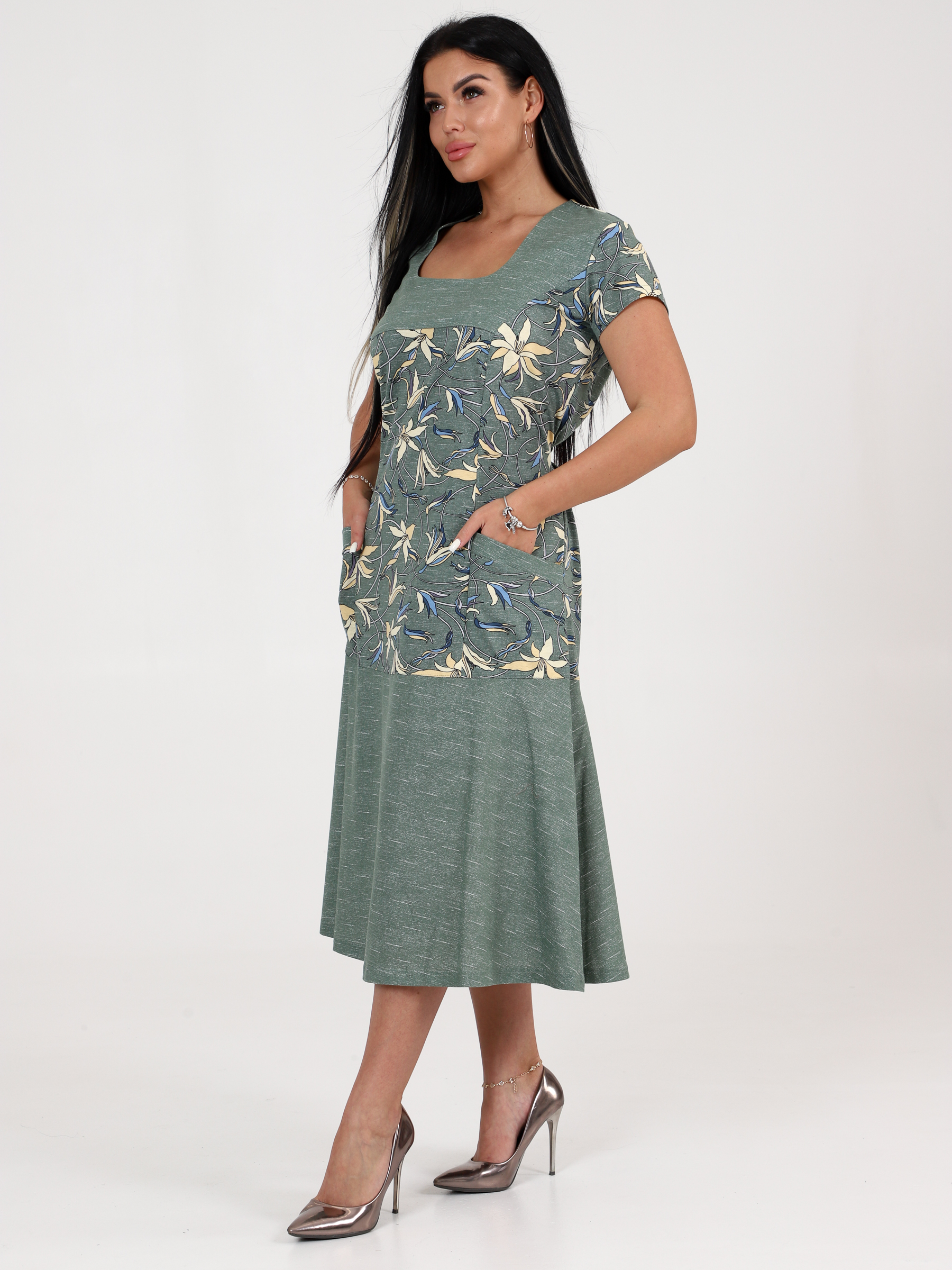 Платье трикотажное больших размеров, хорошо сидит по фигуре. В боковых швах 2 хлястика. Для практичности предусмотрены 2 накладных кармана.