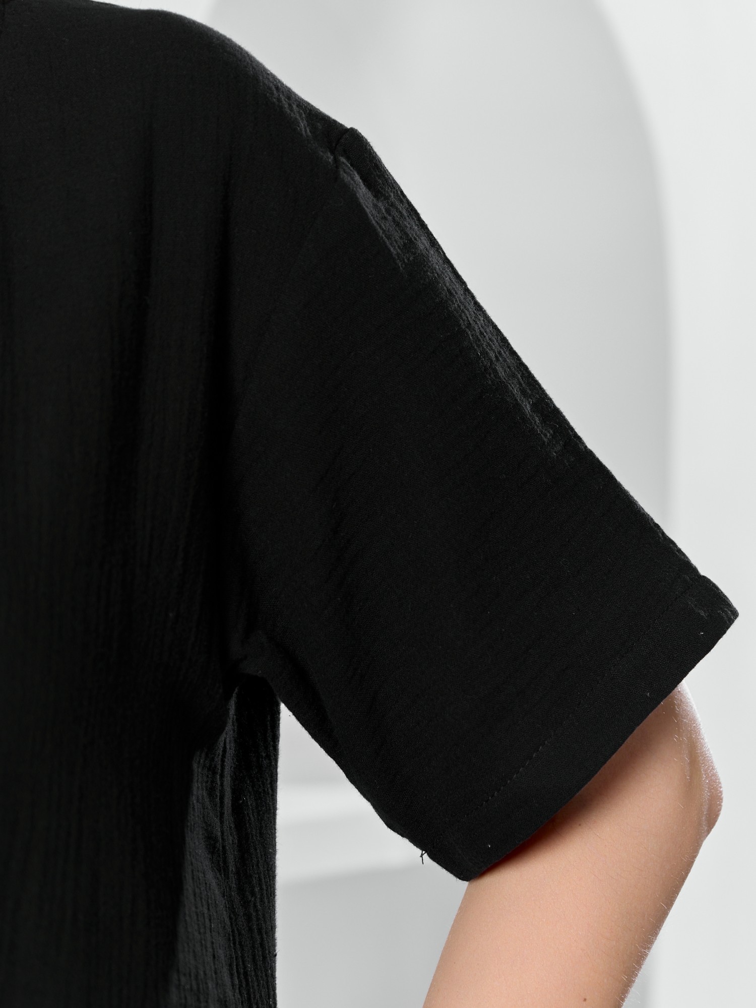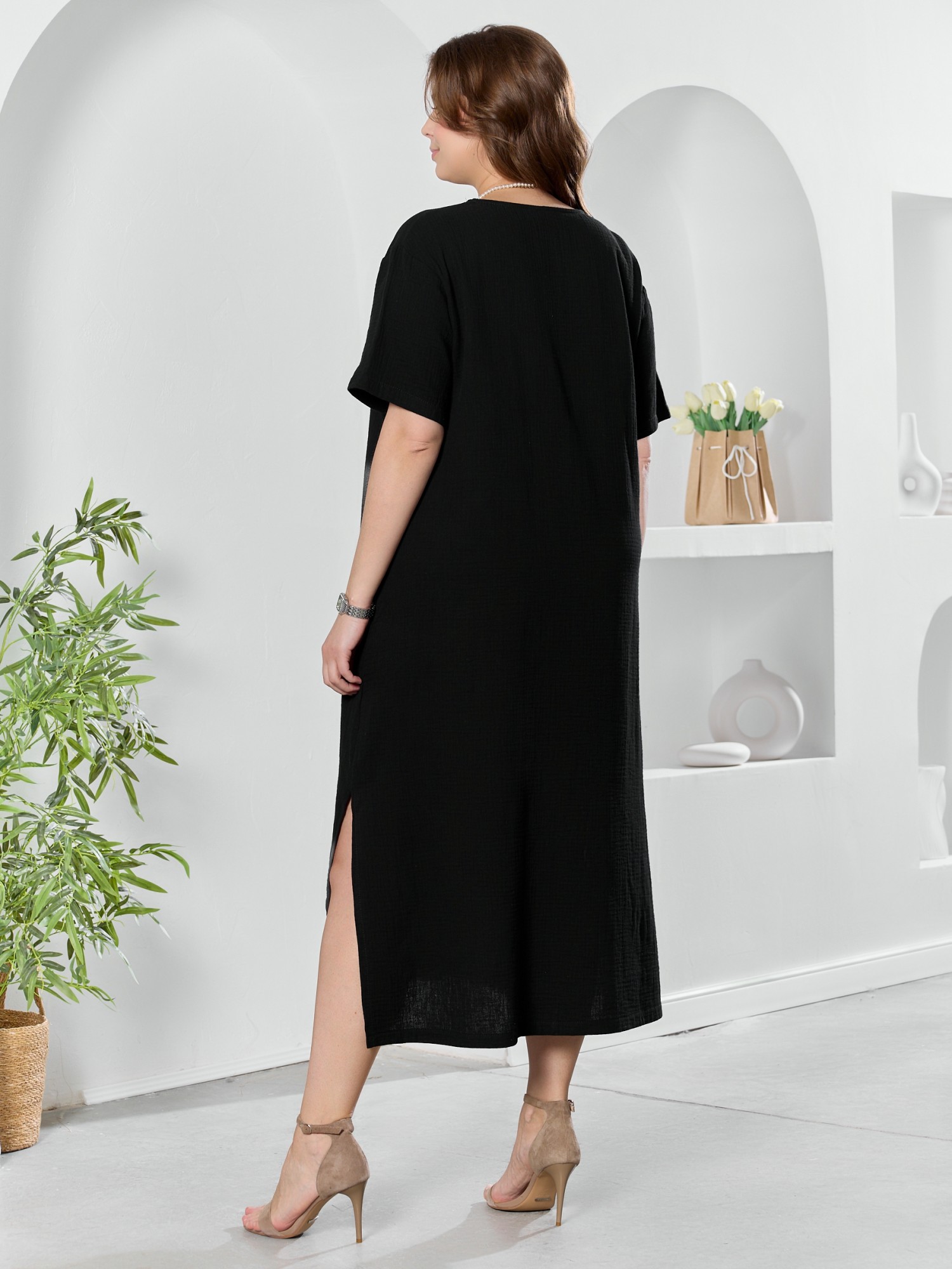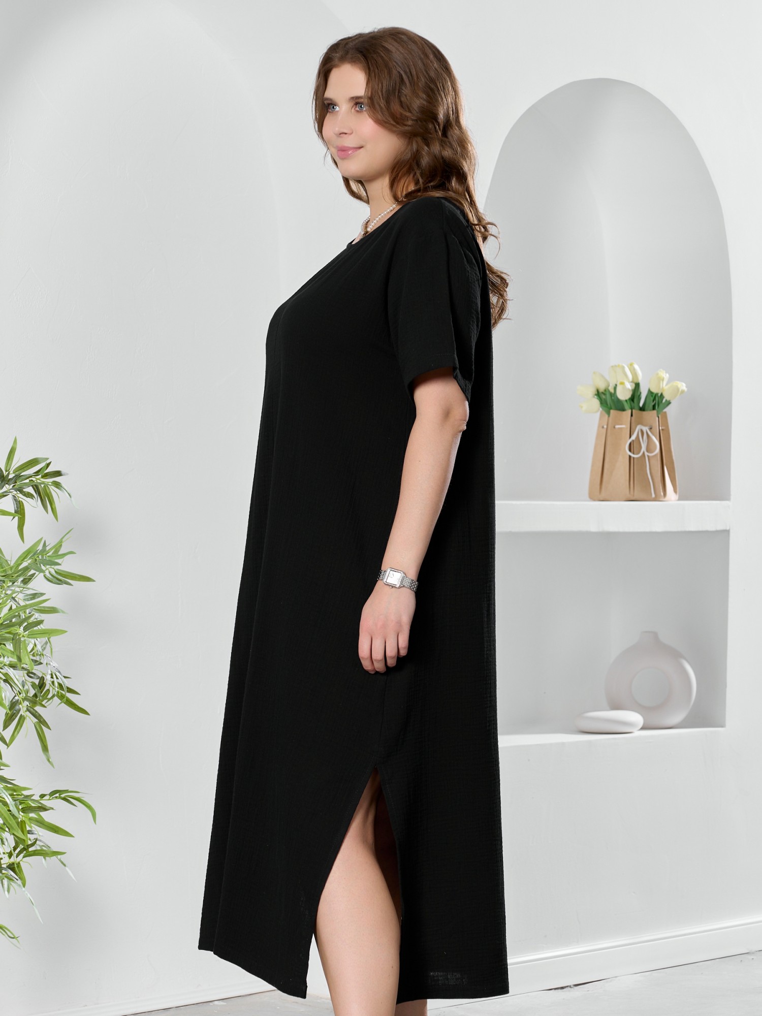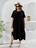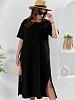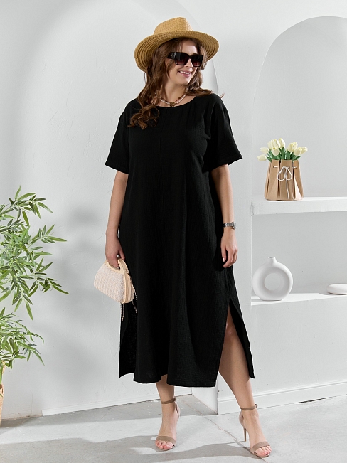 Платье женское из гладкокрашеного тканого полотна «муслин», прямого покроя, с горловиной овальной формы, короткими втачными рукавами. Полочка состоит из двух частей, в шве соединения деталей по центру – разрез, горловина окантована основным материалом.