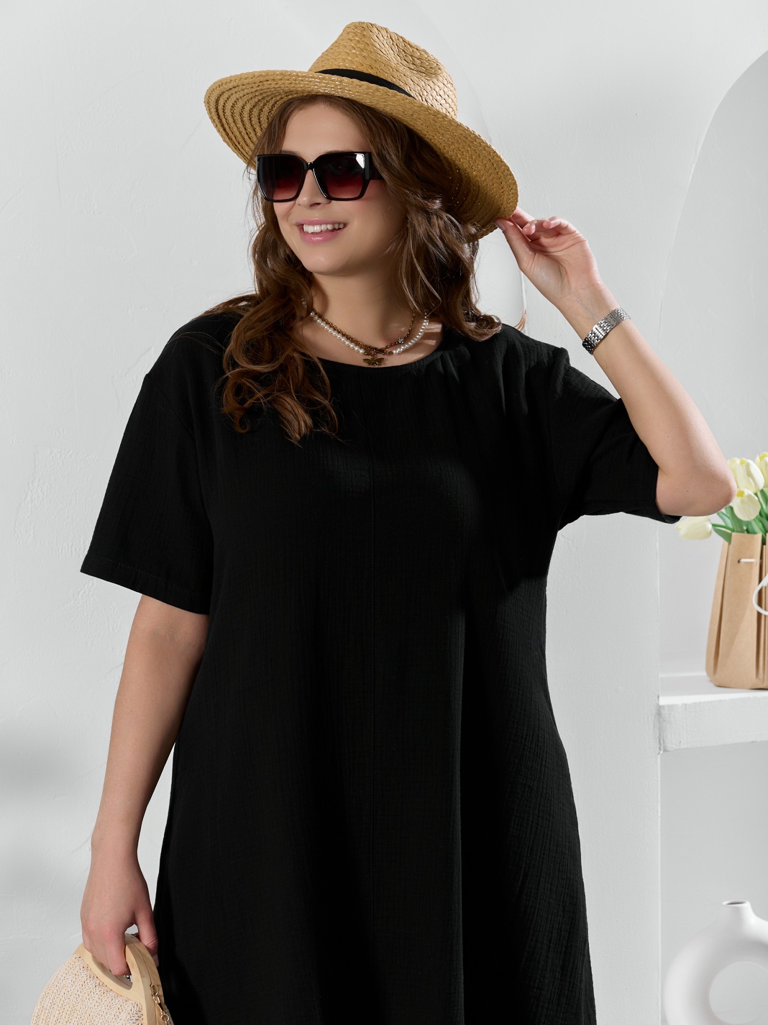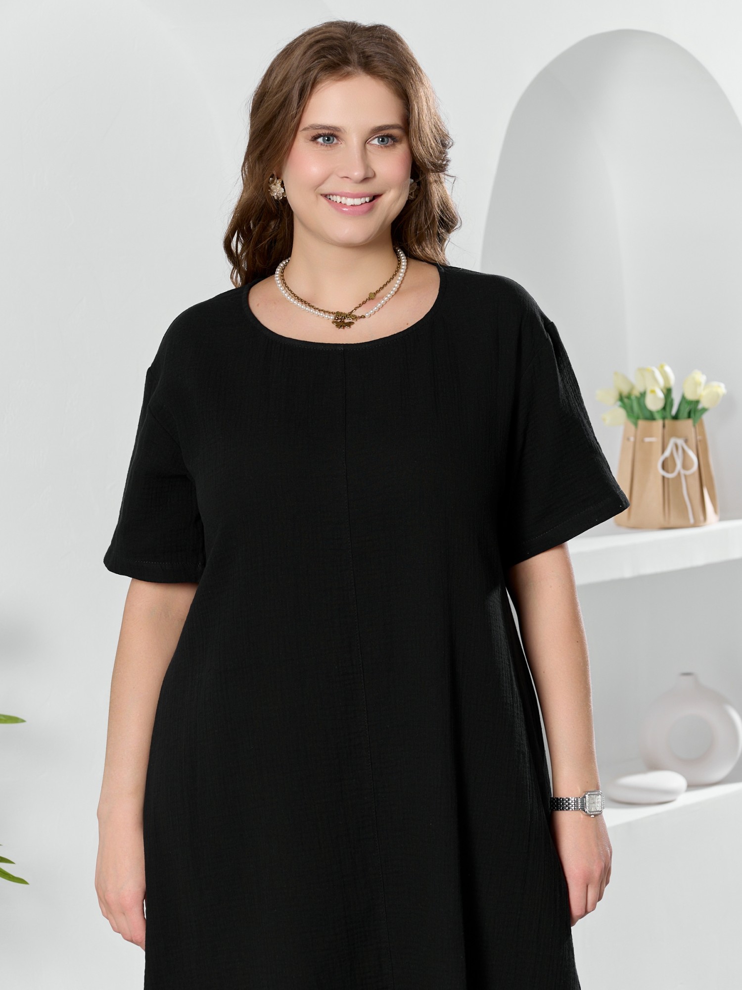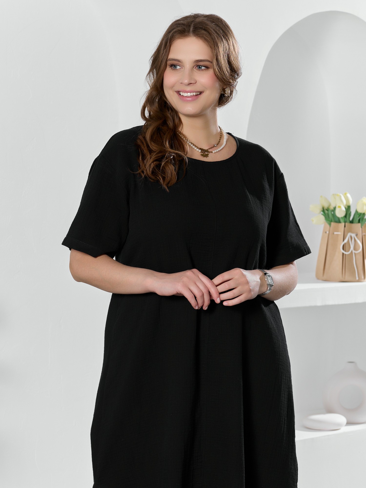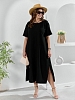 Платье женское из гладкокрашеного тканого полотна «муслин», прямого покроя, с горловиной овальной формы, короткими втачными рукавами. Полочка состоит из двух частей, в шве соединения деталей по центру – разрез, горловина окантована основным материалом.