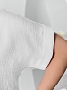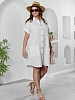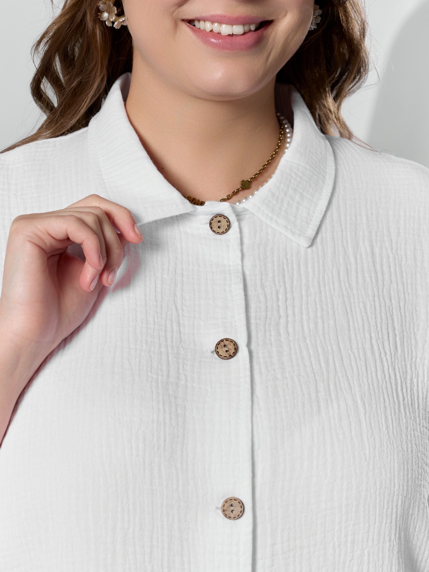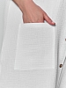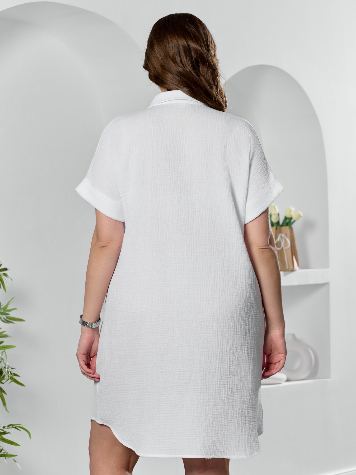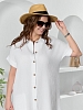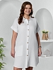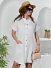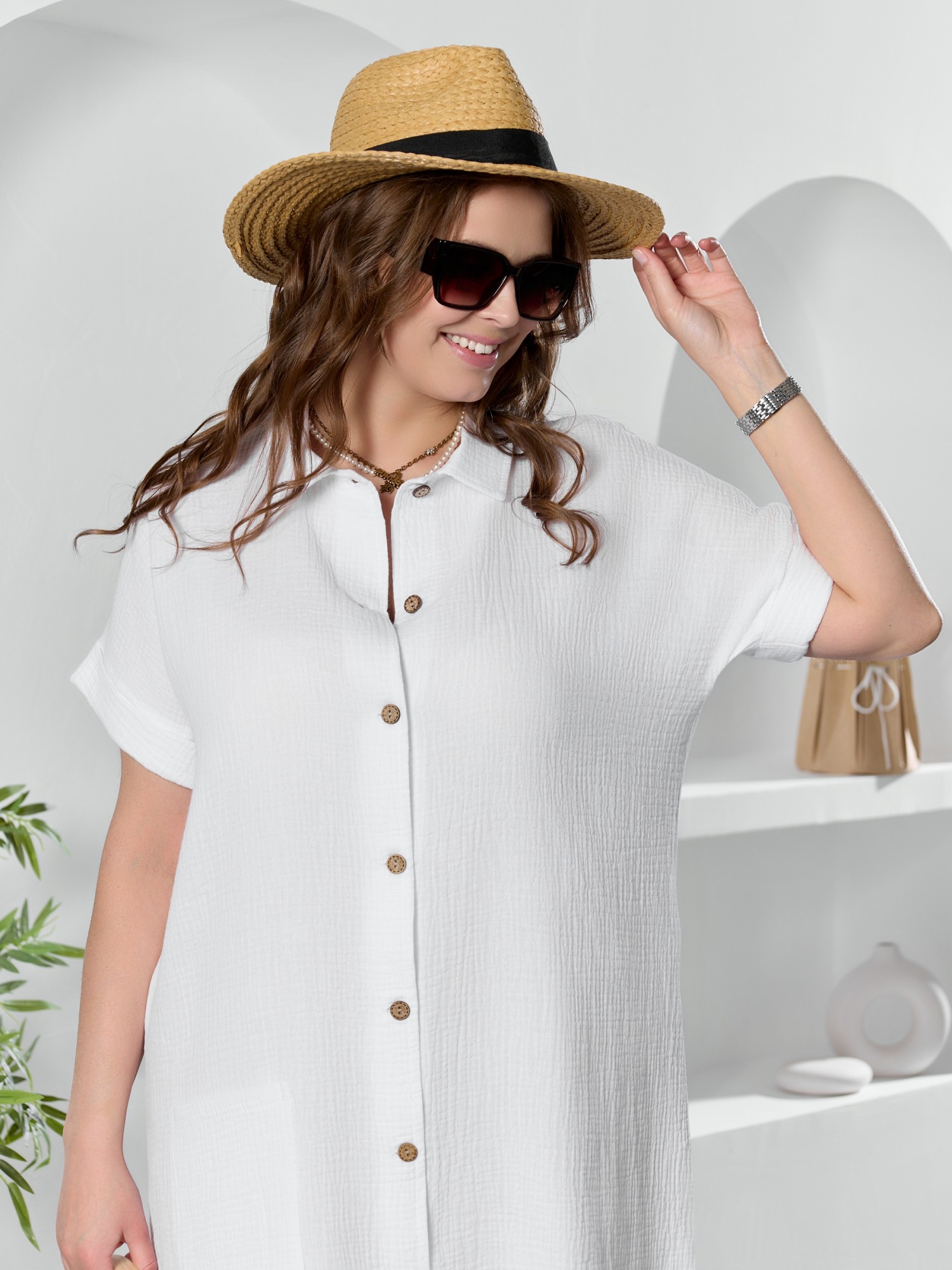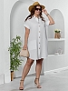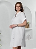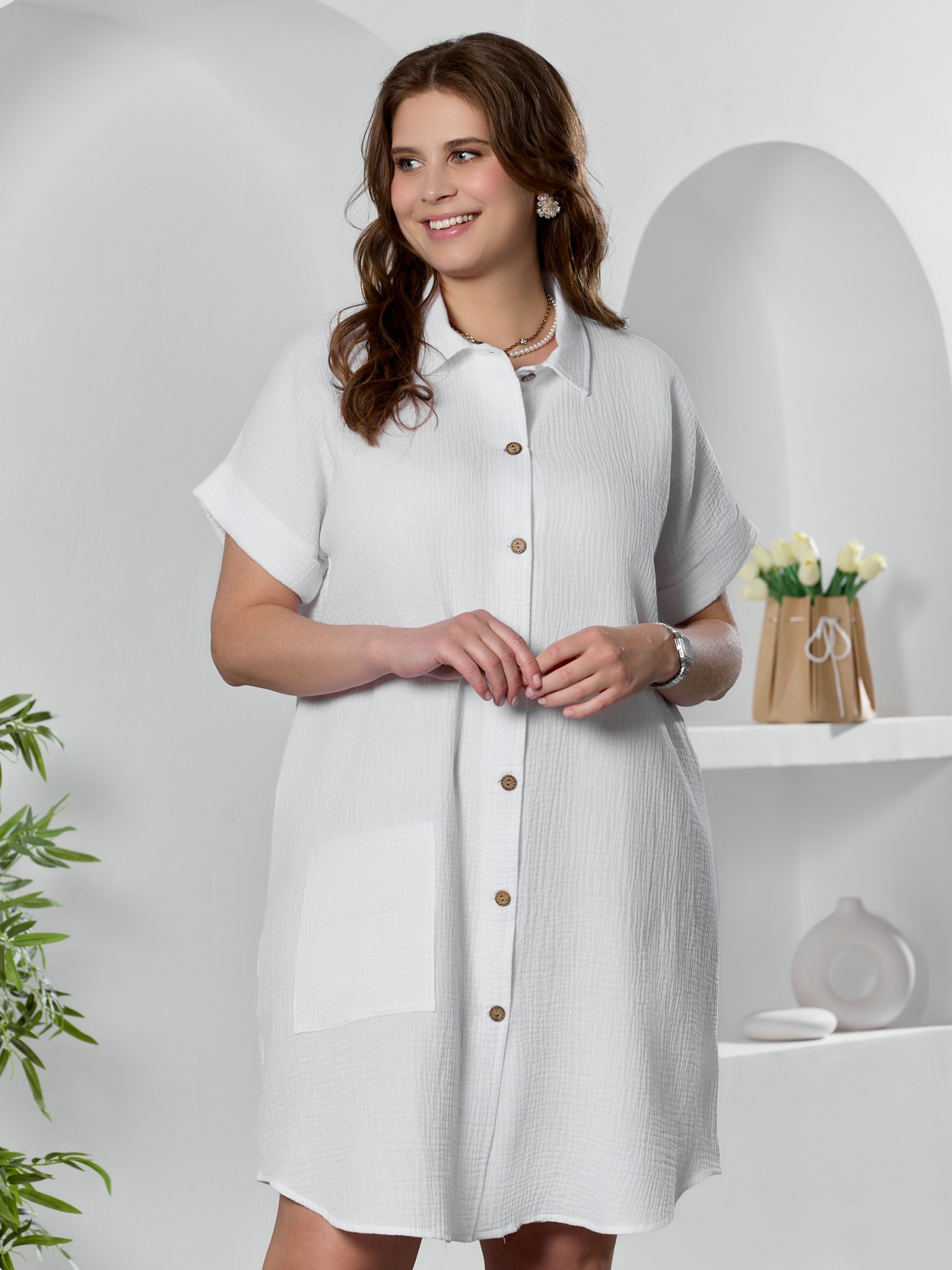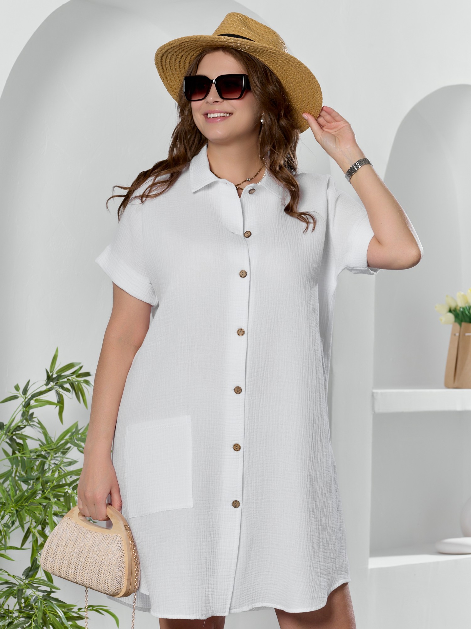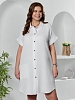 Платье женское из гладкокрашеного тканого полотна «муслин», полуприлегающего силуэта, длиной до колен, с короткими цельнокроеными рукавами, низ которых обработан манжетами, стояче-отложным воротником, центральной бортовой застежкой на петли и пуговицы, фигурной линией низа. На правой полочке в области бедер настрочен накладной карман.