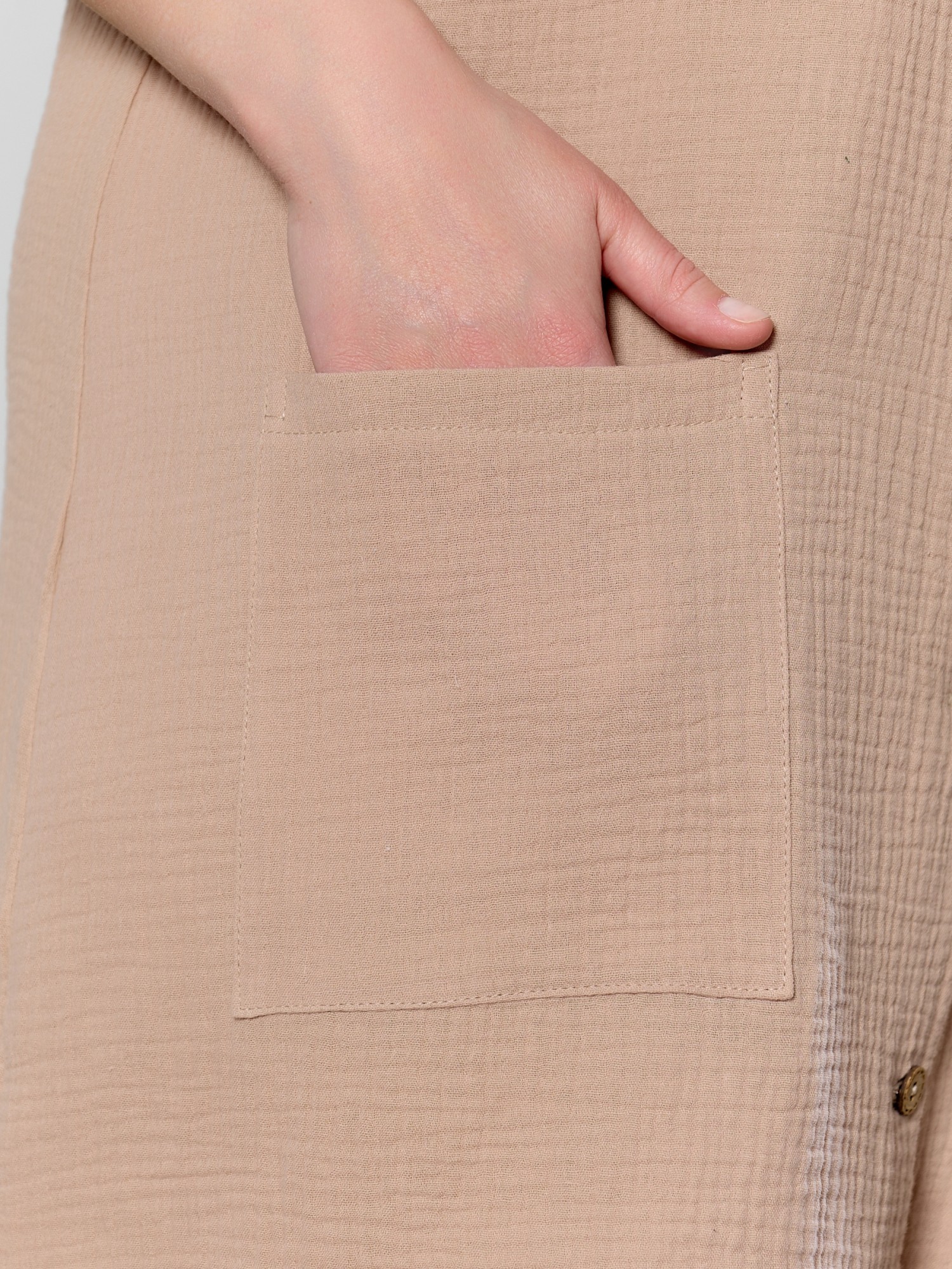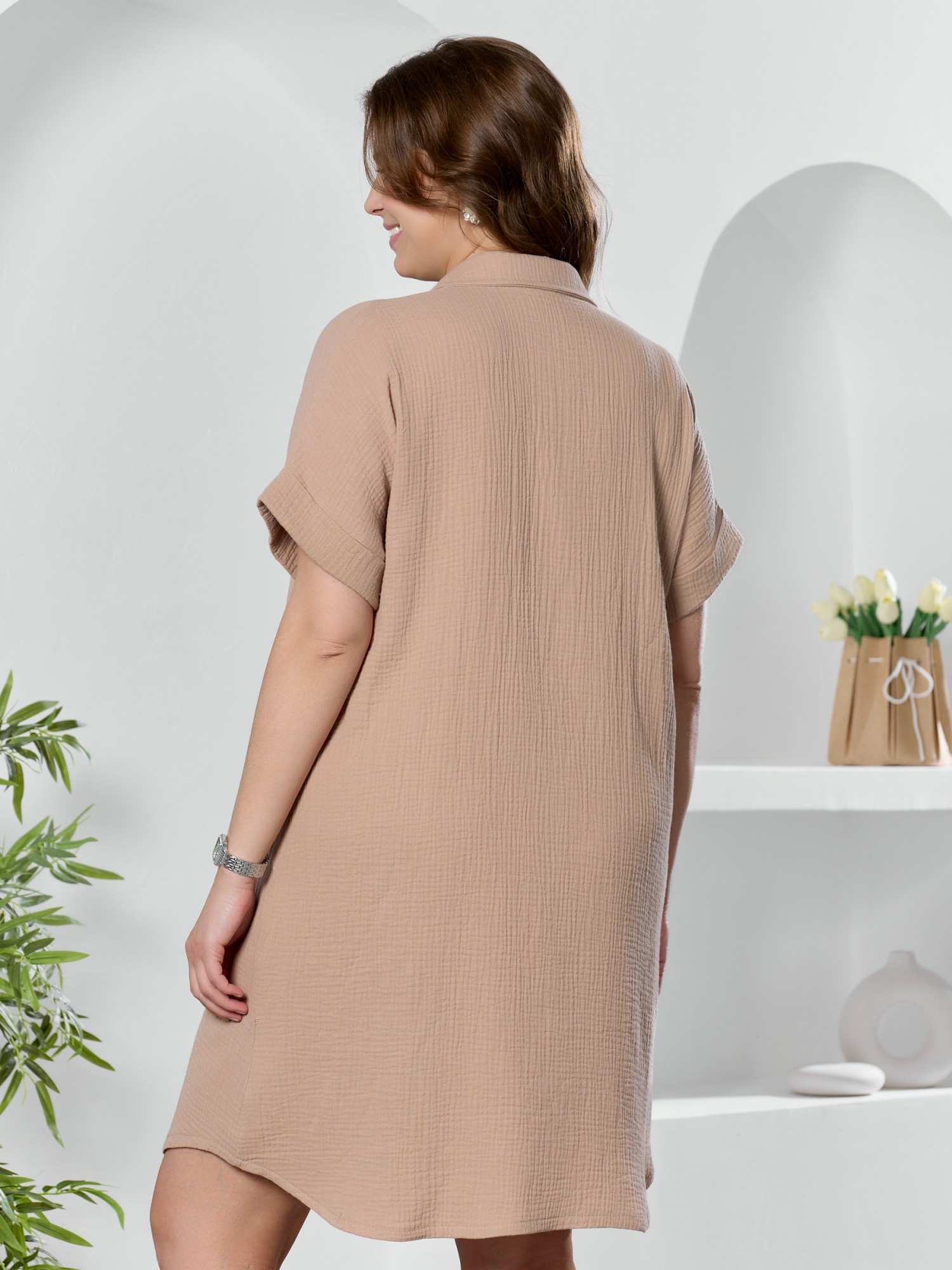 Платье женское из гладкокрашеного тканого полотна «муслин», полуприлегающего силуэта, длиной до колен, с короткими цельнокроеными рукавами, низ которых обработан манжетами, стояче-отложным воротником, центральной бортовой застежкой на петли и пуговицы, фигурной линией низа. На правой полочке в области бедер настрочен накладной карман.