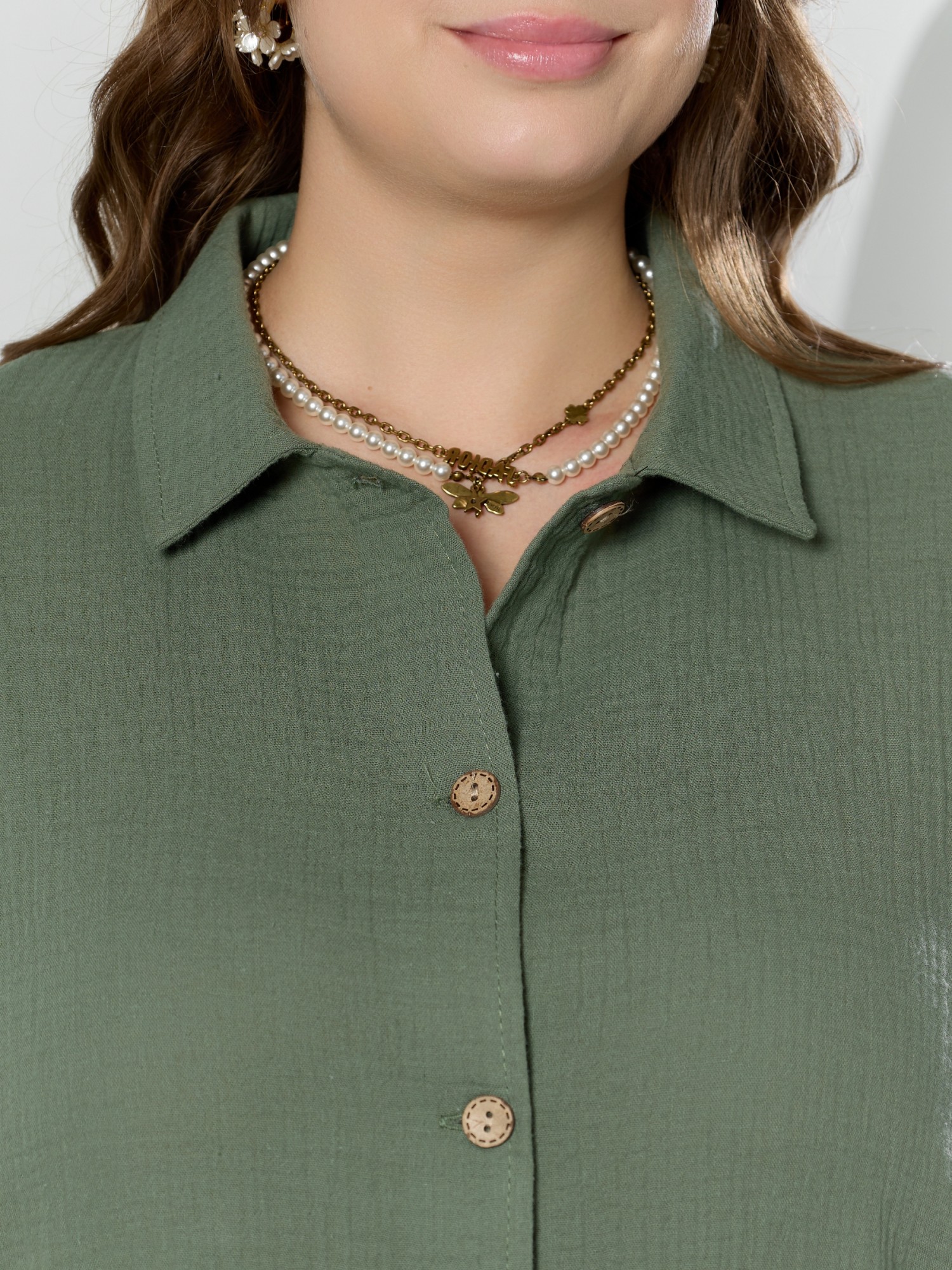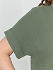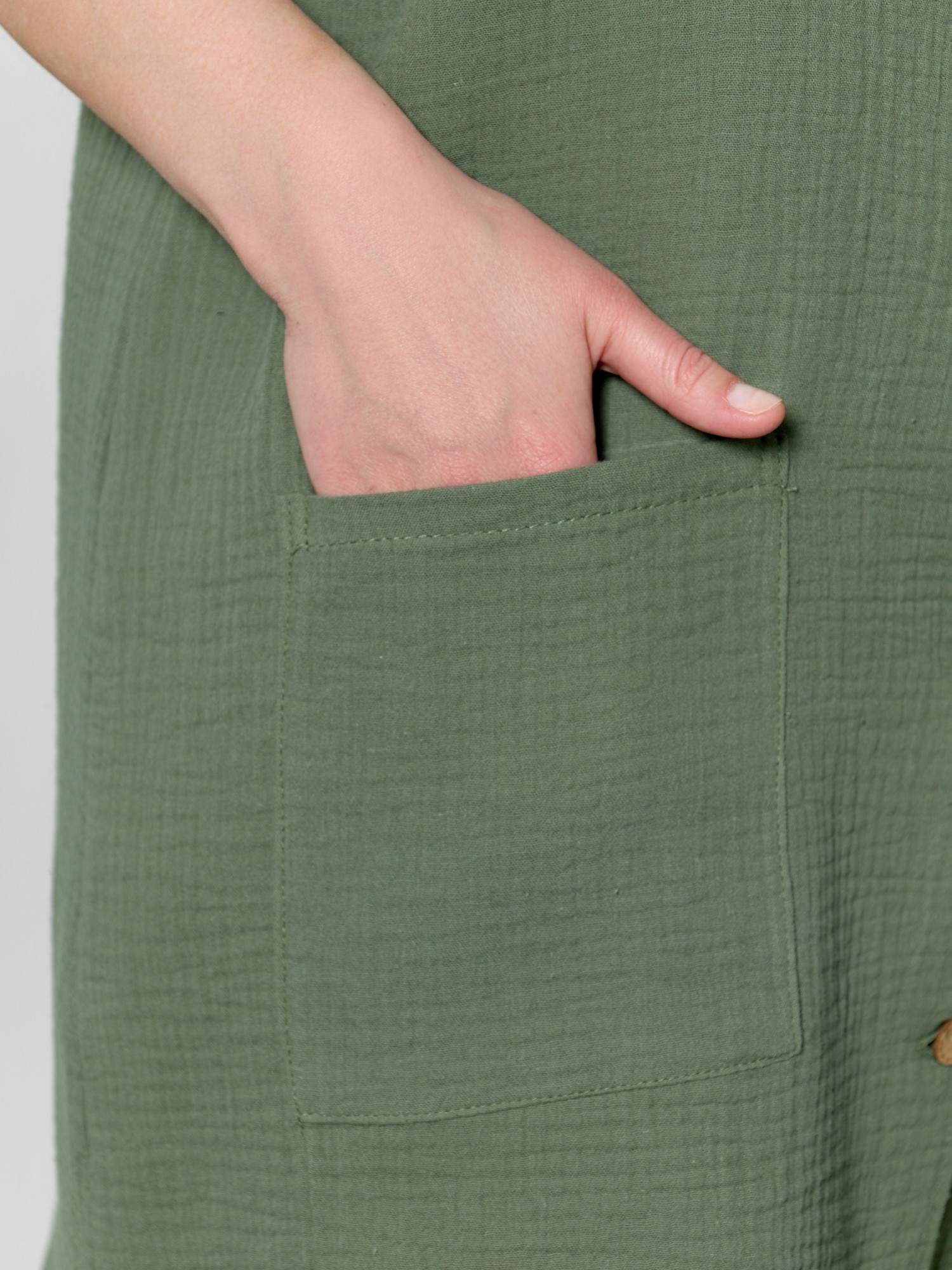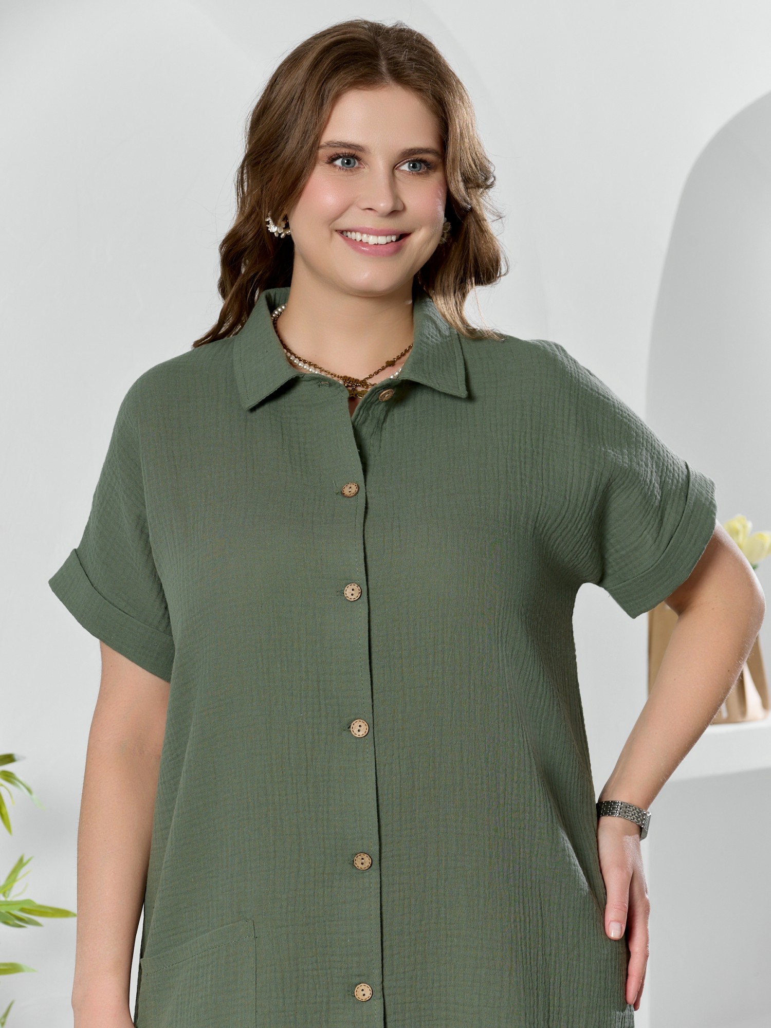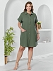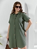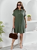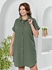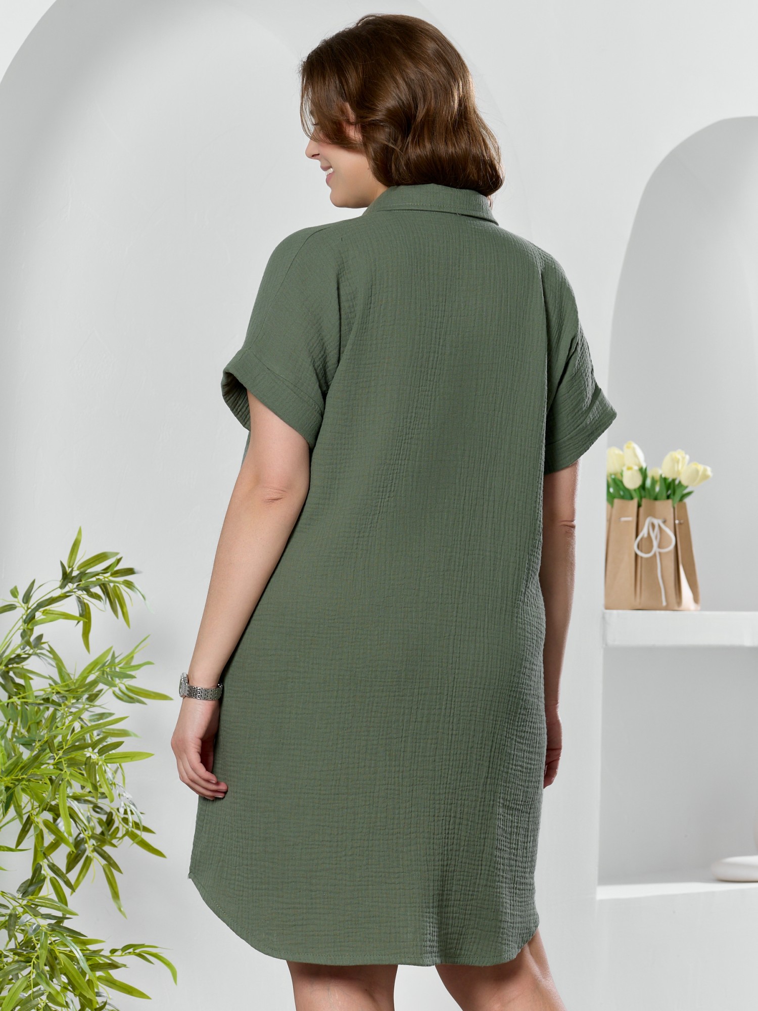 Платье женское из гладкокрашеного тканого полотна «муслин», полуприлегающего силуэта, длиной до колен, с короткими цельнокроеными рукавами, низ которых обработан манжетами, стояче-отложным воротником, центральной бортовой застежкой на петли и пуговицы, фигурной линией низа. На правой полочке в области бедер настрочен накладной карман.