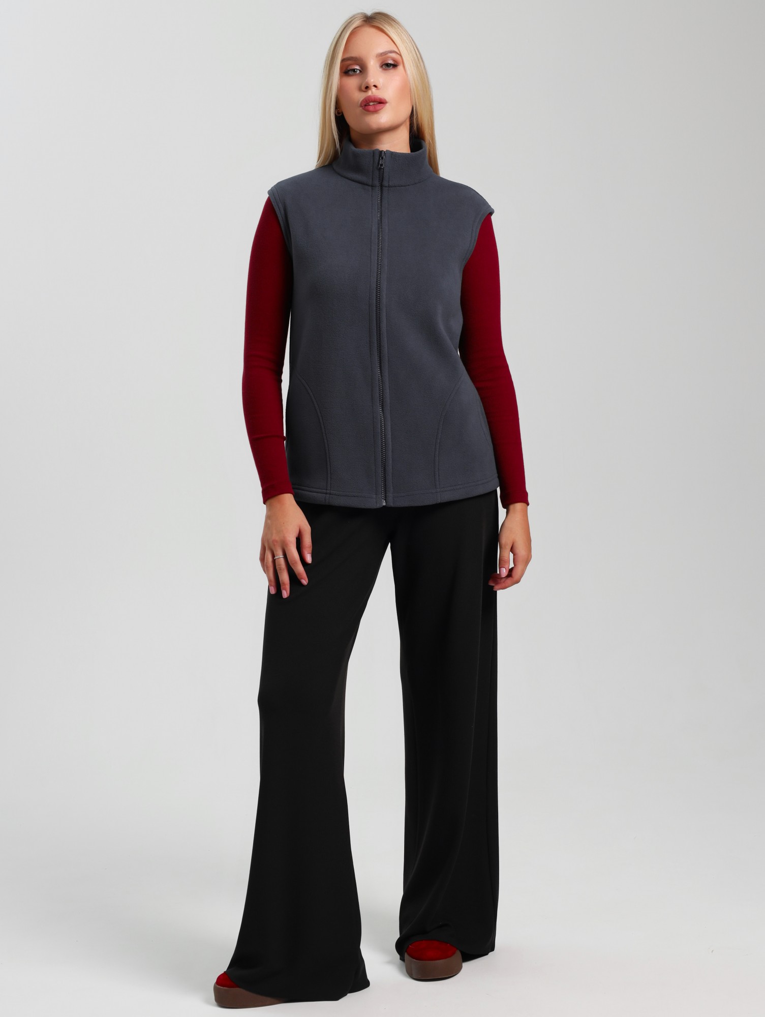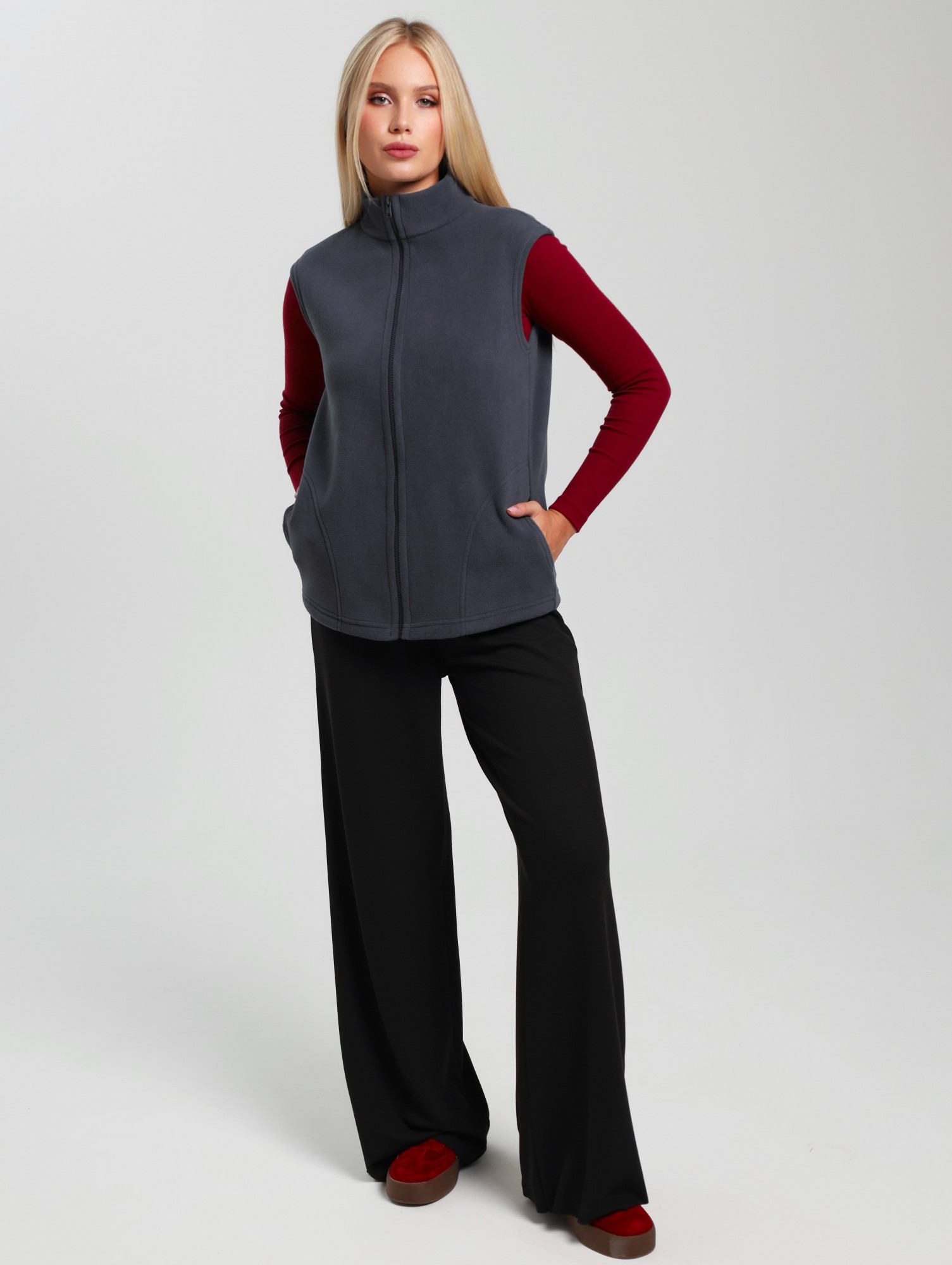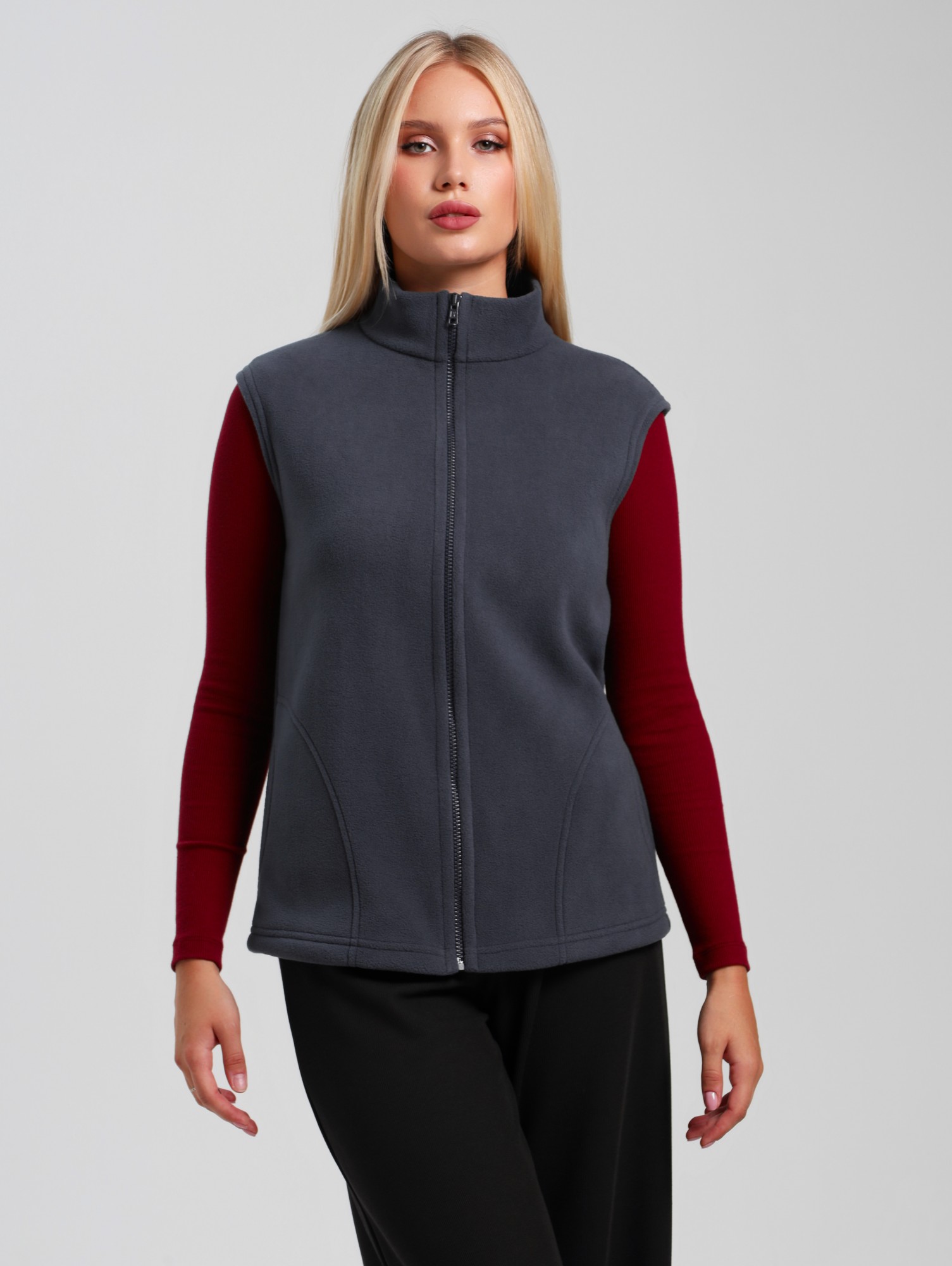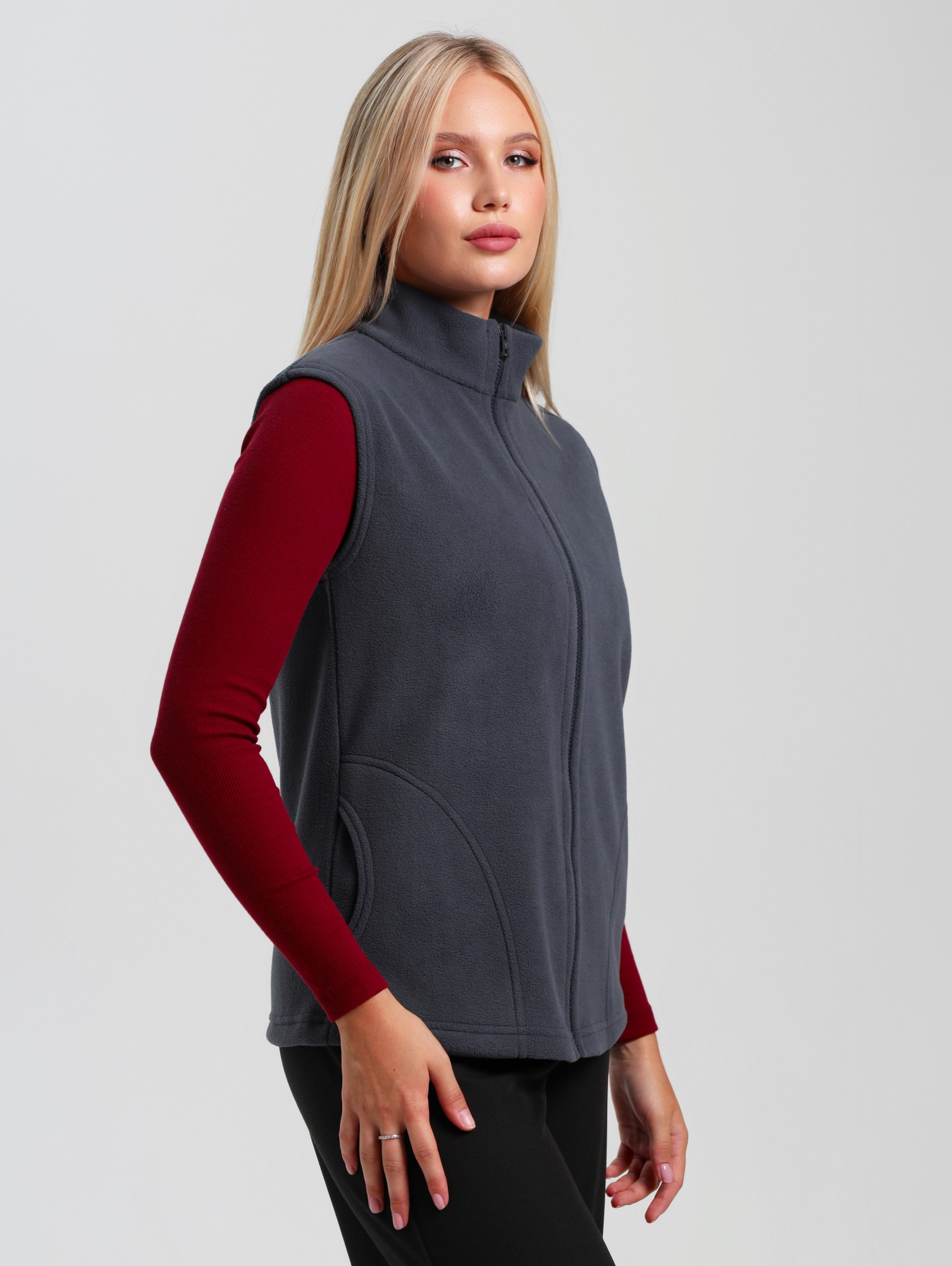 Жилет молодежный из трикотажного полотна «флис», полуприлегающего силуэта, воротником «стойка», карманами в боковых швах фигурной формы, центральной бортовой застежкой на тесьму «молния».