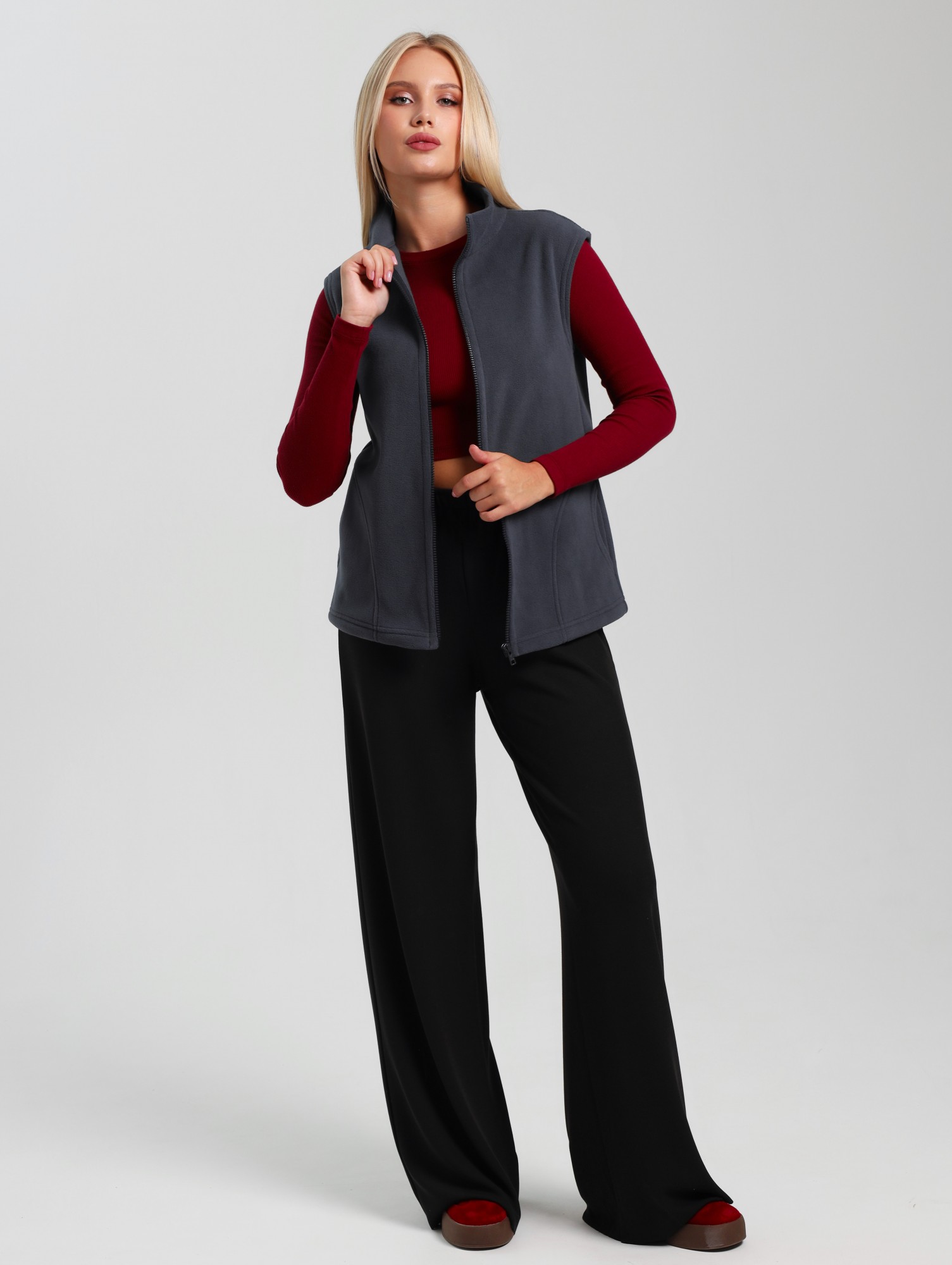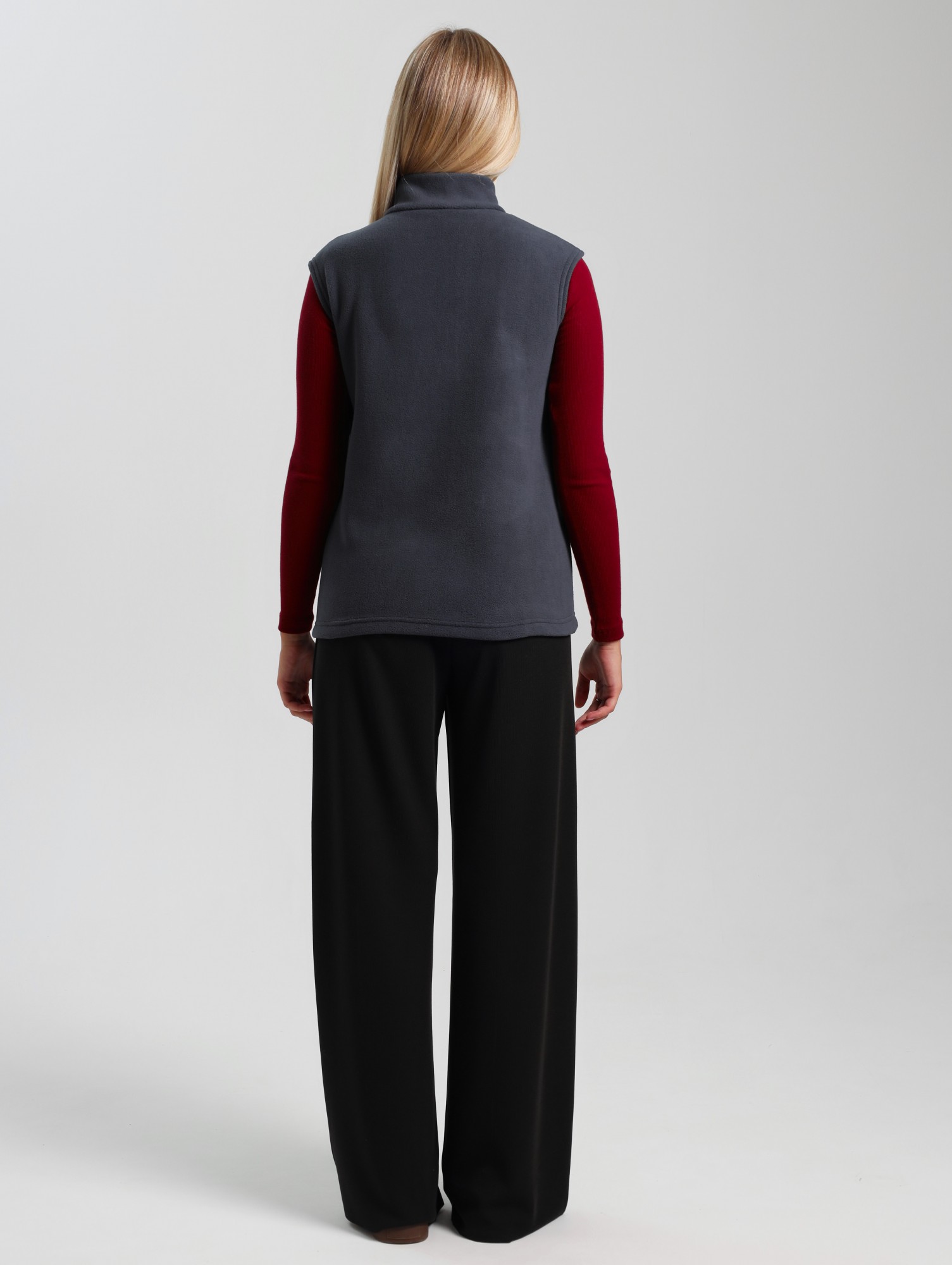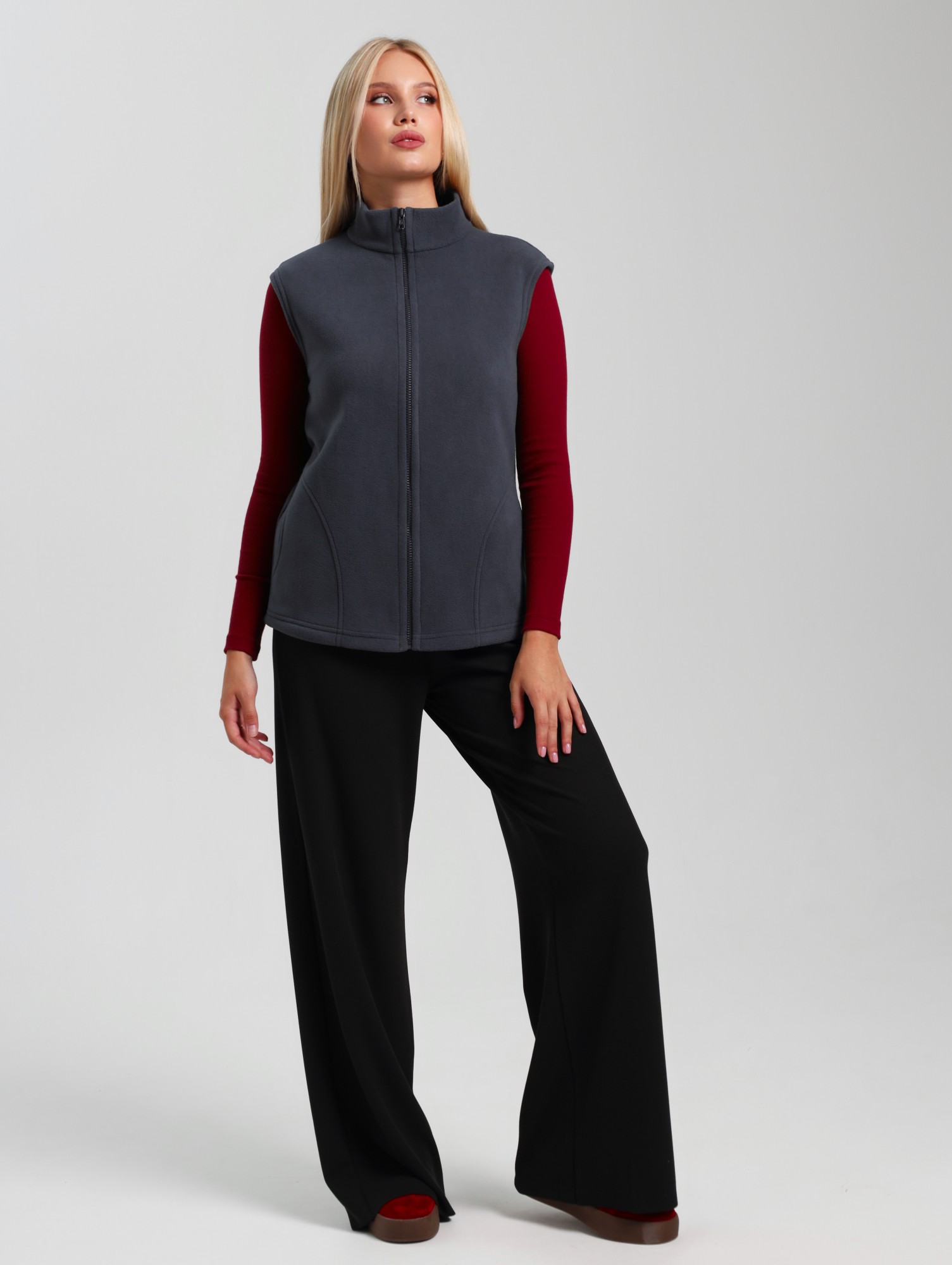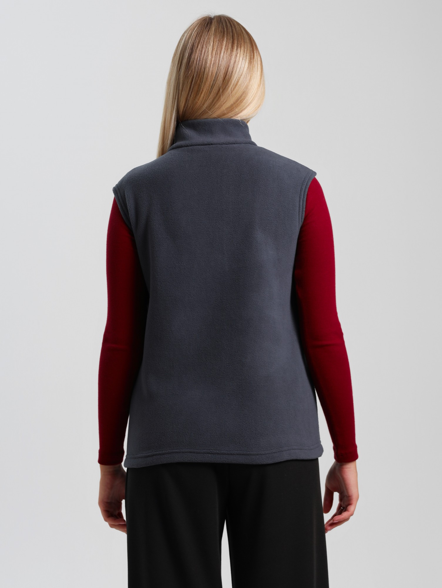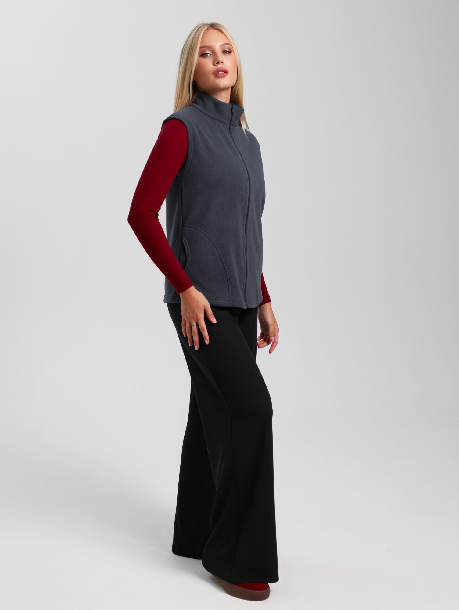 Жилет молодежный из трикотажного полотна «флис», полуприлегающего силуэта, воротником «стойка», карманами в боковых швах фигурной формы, центральной бортовой застежкой на тесьму «молния».