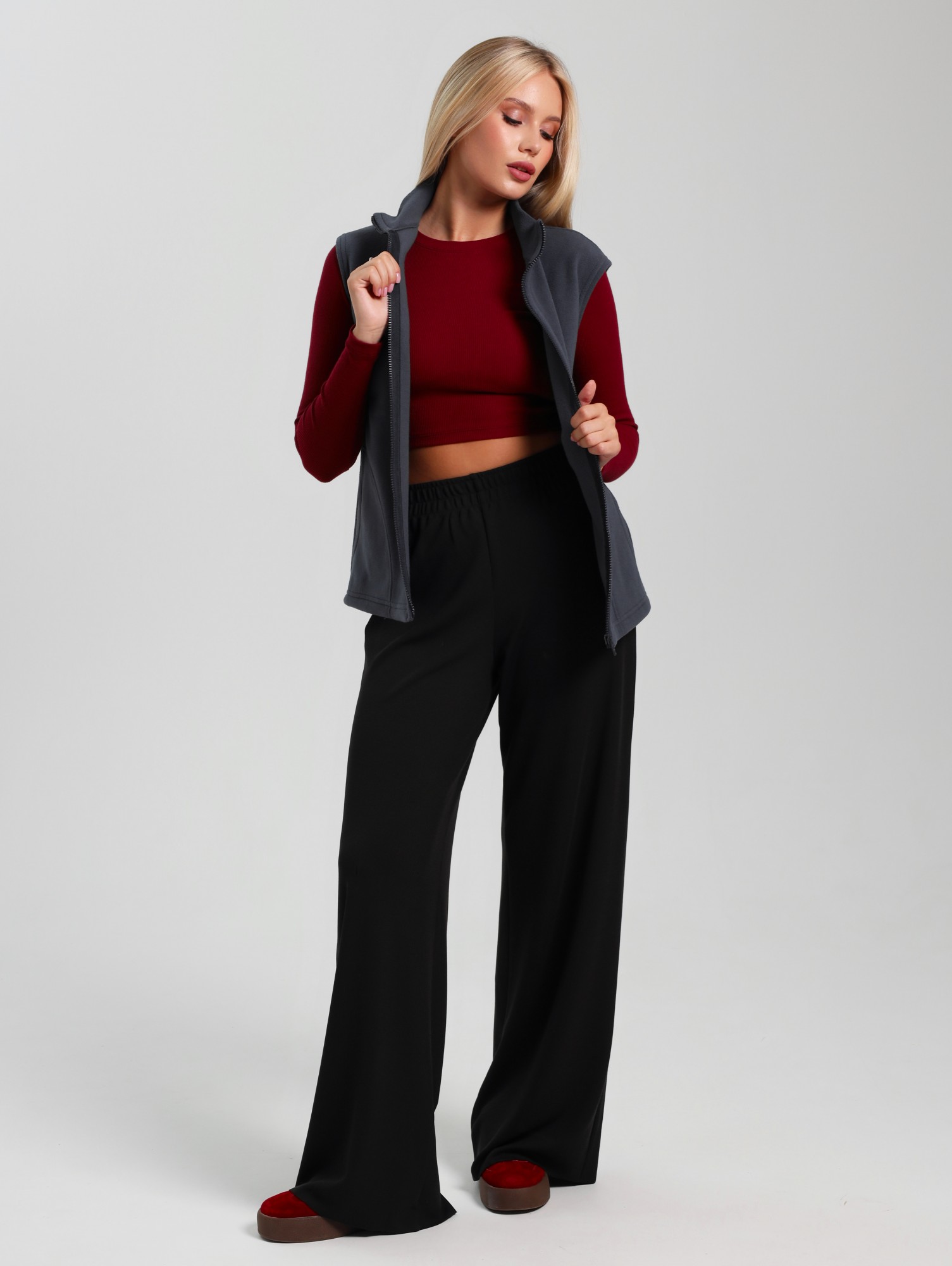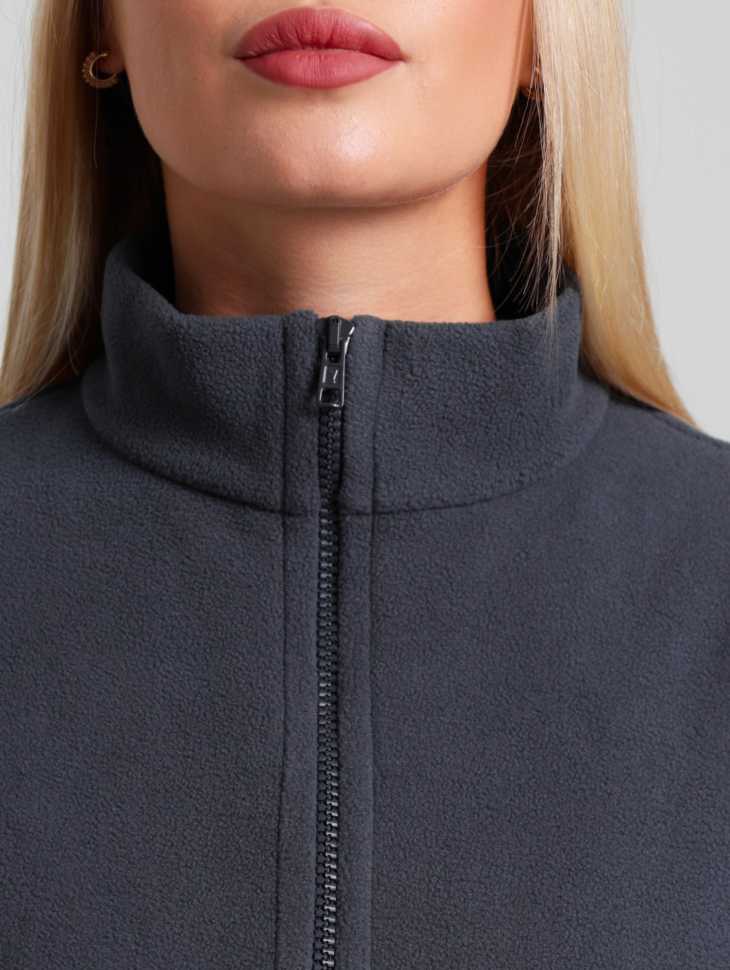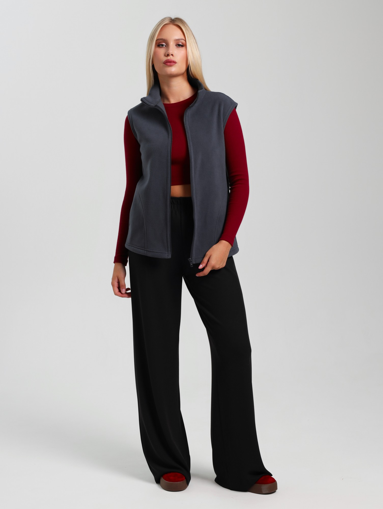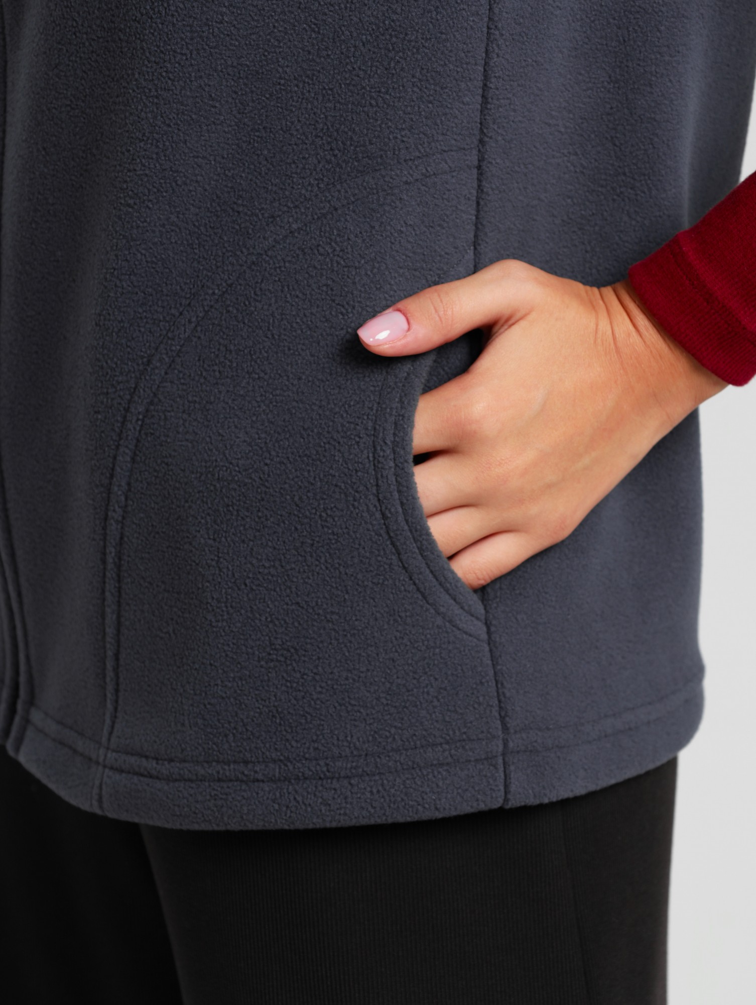 Жилет молодежный из трикотажного полотна «флис», полуприлегающего силуэта, воротником «стойка», карманами в боковых швах фигурной формы, центральной бортовой застежкой на тесьму «молния».